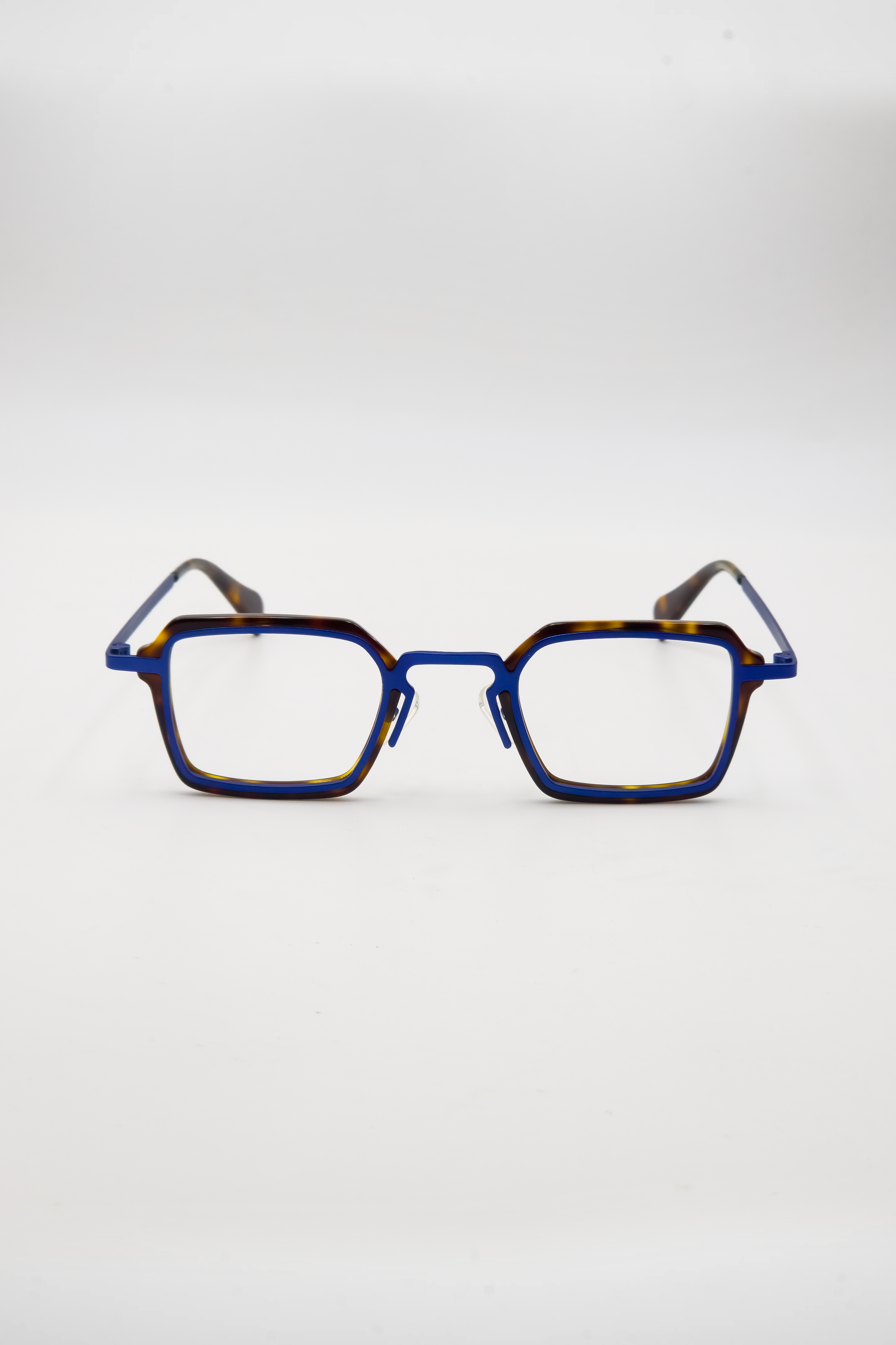 Titanium azul fosco com a autenticidade do acetato italiano havana, criando uma estrutura leve, resistente e marcante.