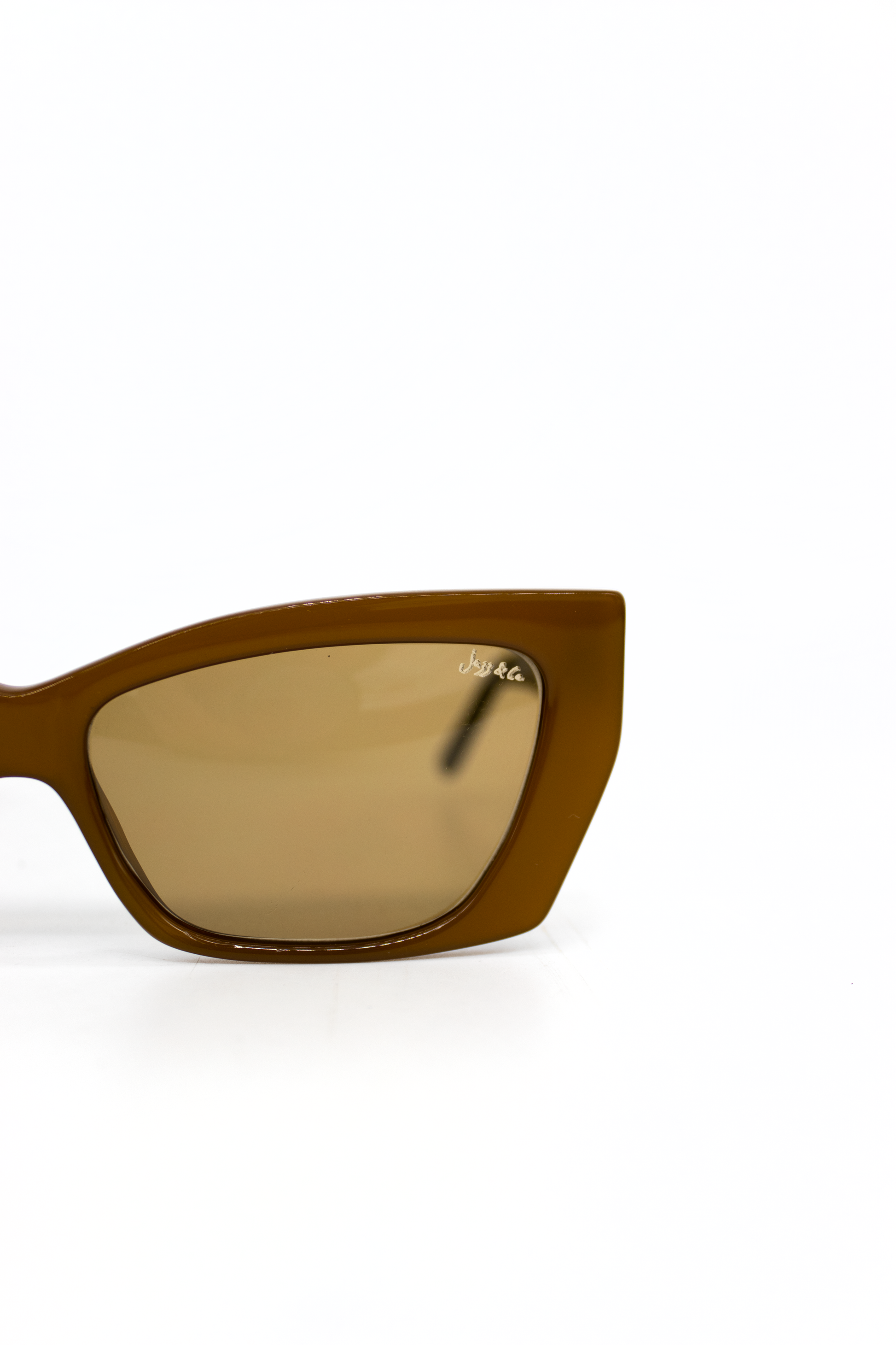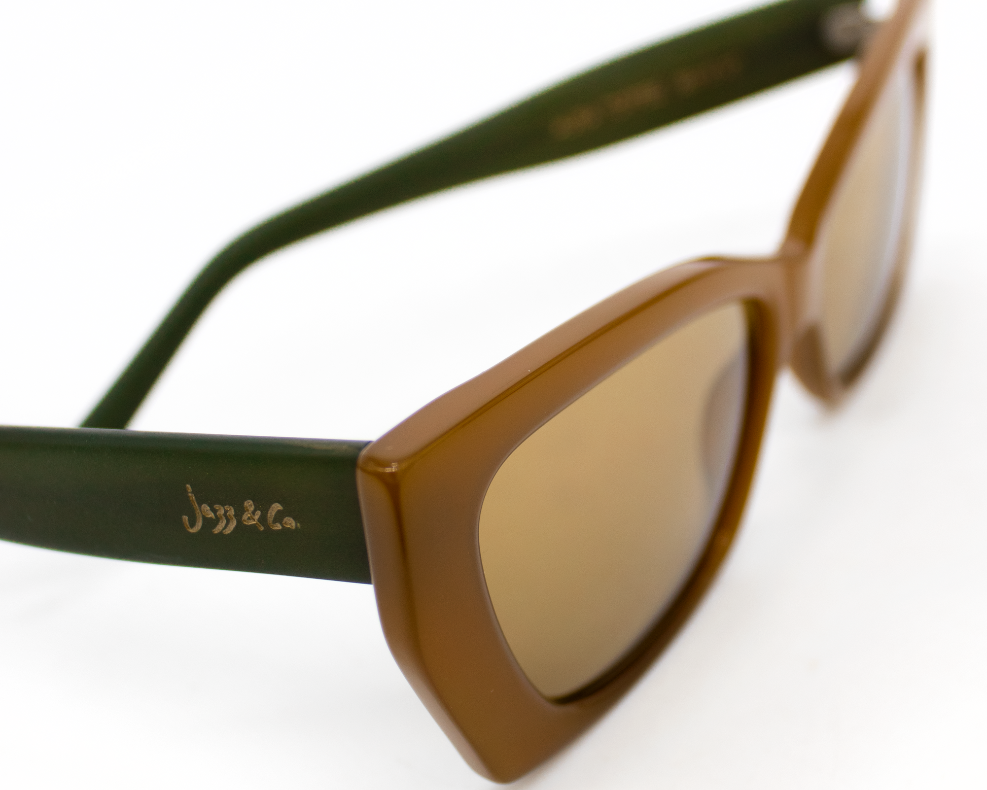 Celebrando o contraste e a sofisticação tropical, o Aura Toffee traduz a elegância de quem enxerga o design como extensão da própria narrativa. Suas curvas firmes e vértices sutis revelam uma presença visual confiante, enquanto o logo dourado Jazz & Co. nas hastes reforça a assinatura de um olhar com identidade e propósito.