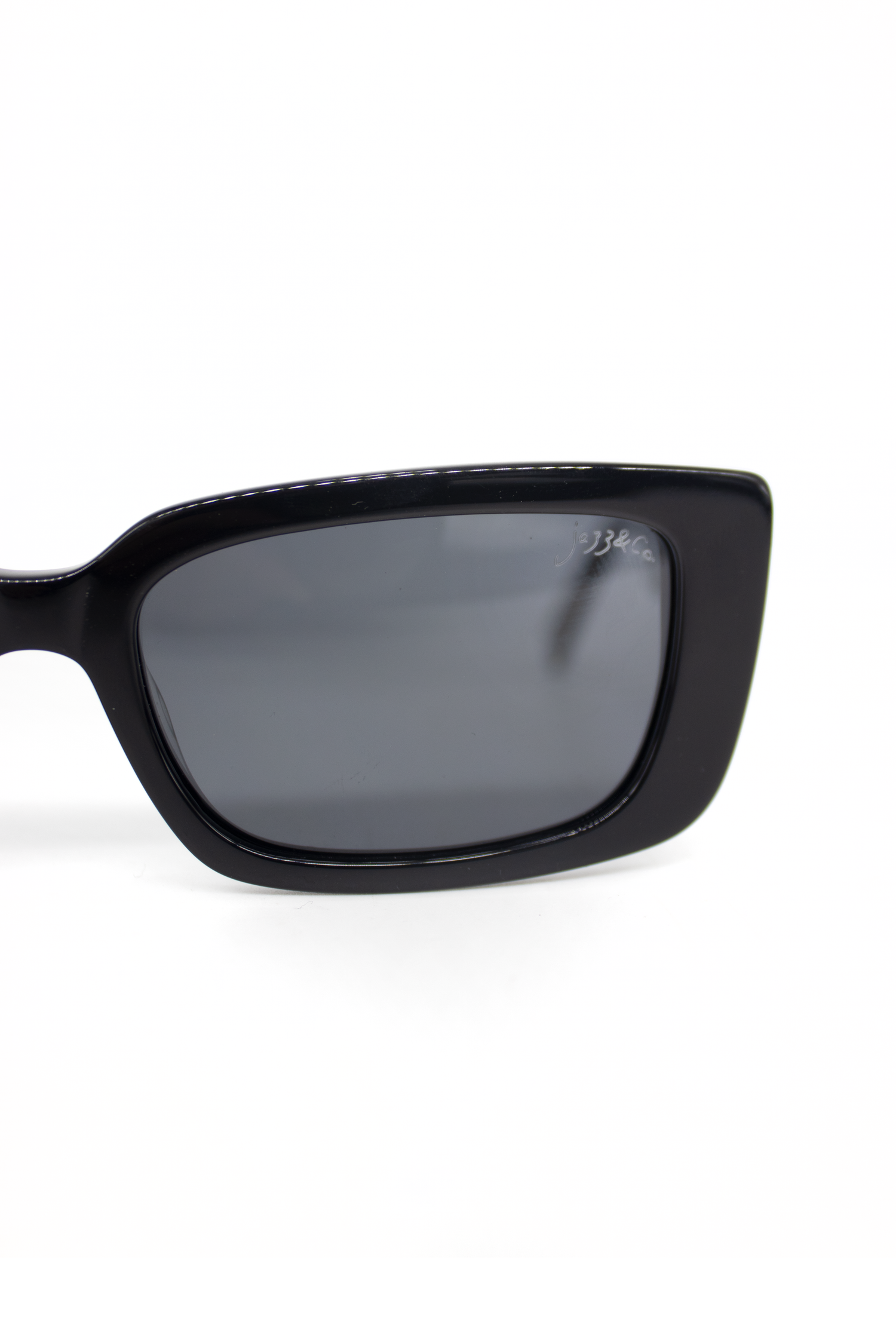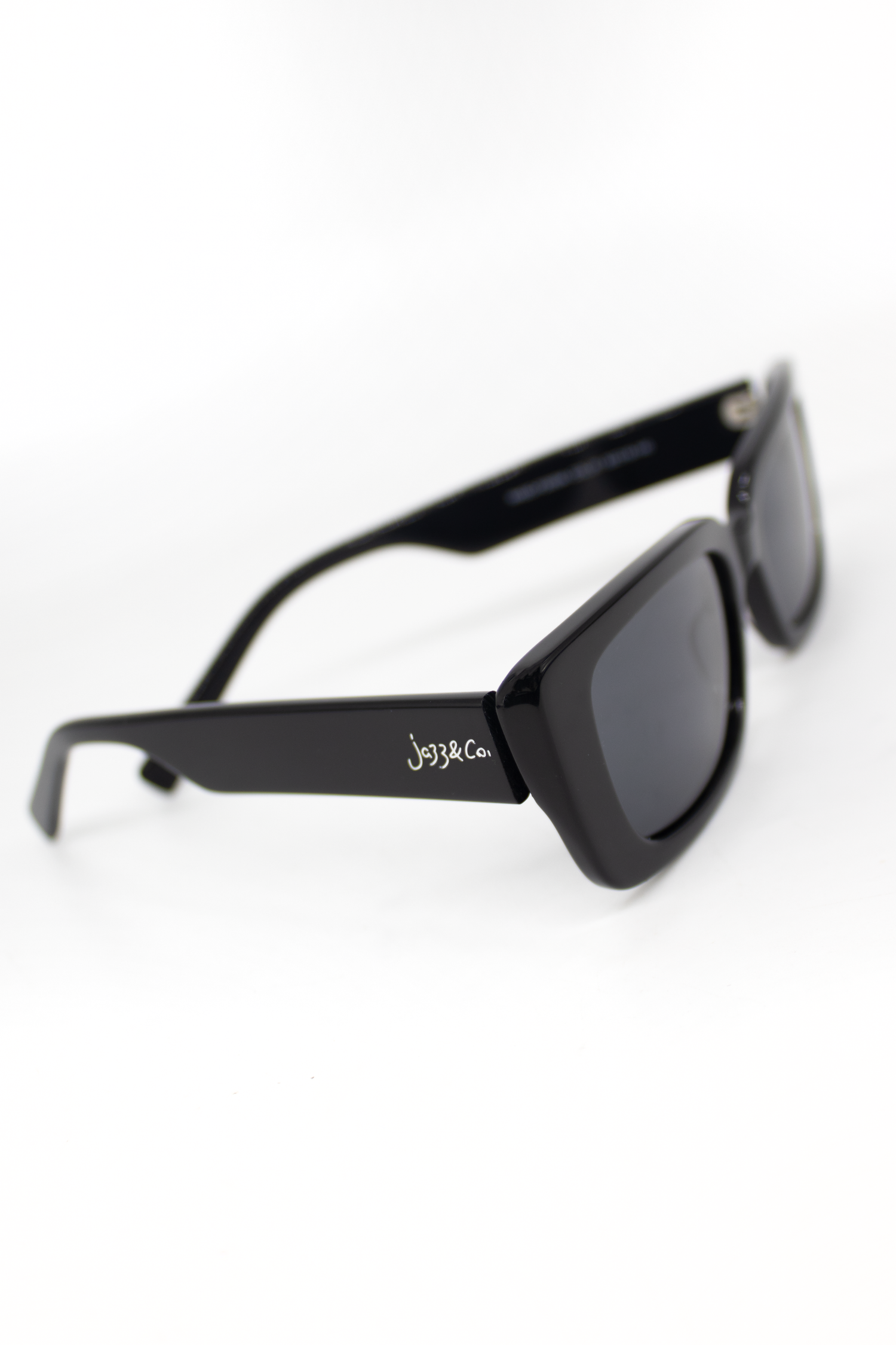 Armação retangular em acetato preto espesso, feita com acabamento em alto brilho que realça a profundidade da cor e o toque refinado do material. Suas curvas amplas e hastes largas garantem estrutura firme, presença visual e encaixe confortável para rostos médios a largos. O logo dourado Jazz & Co. aparece como assinatura de sofisticação e autenticidade.