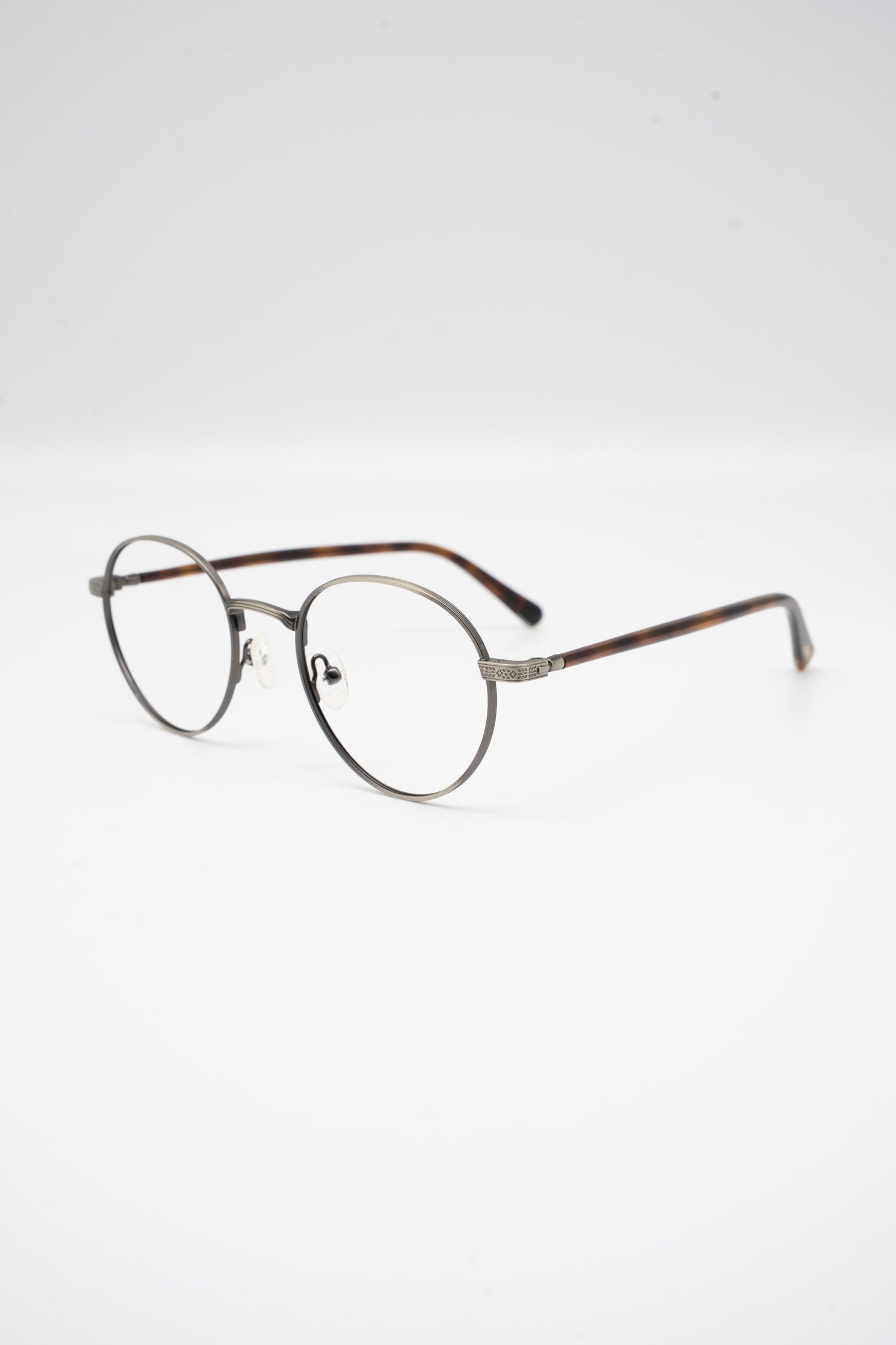 Armação redonda em metal chumbo escovado, inspirada na estética refinada e simétrica da era Art Déco. Seu design combina estrutura leve e resistente com acabamento metálico discreto, garantindo conforto prolongado e encaixe preciso para rostos pequenos a médios.