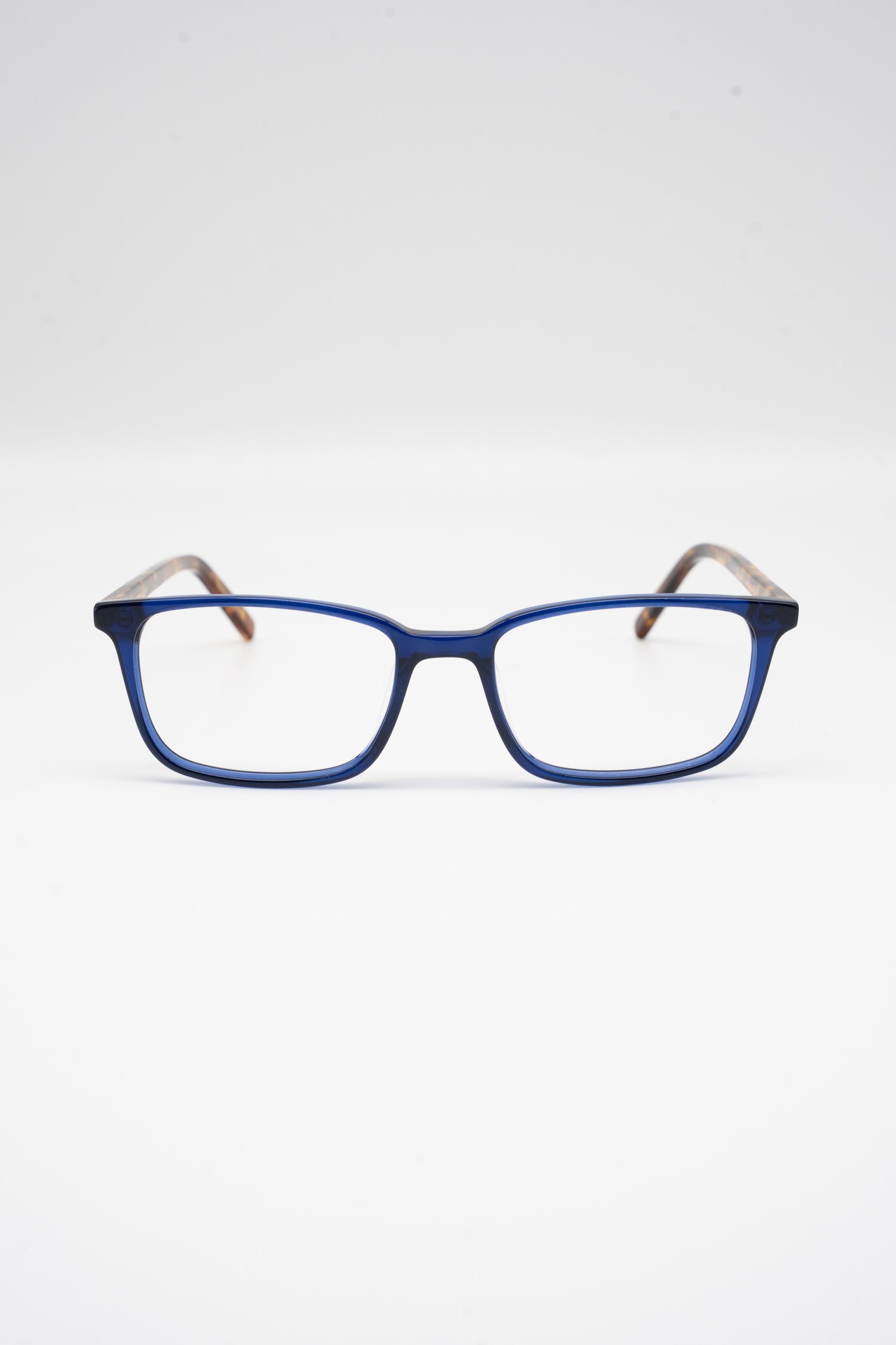 Uma armação quadrada estreita em acetato azul profundo, com hastes em padrão demi que equilibram contraste e harmonia visual. Seu design estruturado oferece ajuste firme e confortável, ideal para rostos médios, combinando durabilidade, leveza e compatibilidade com lentes graduadas. O acetato premium confere brilho, estabilidade e acabamento refinado, expressando a união entre tradição e modernidade.