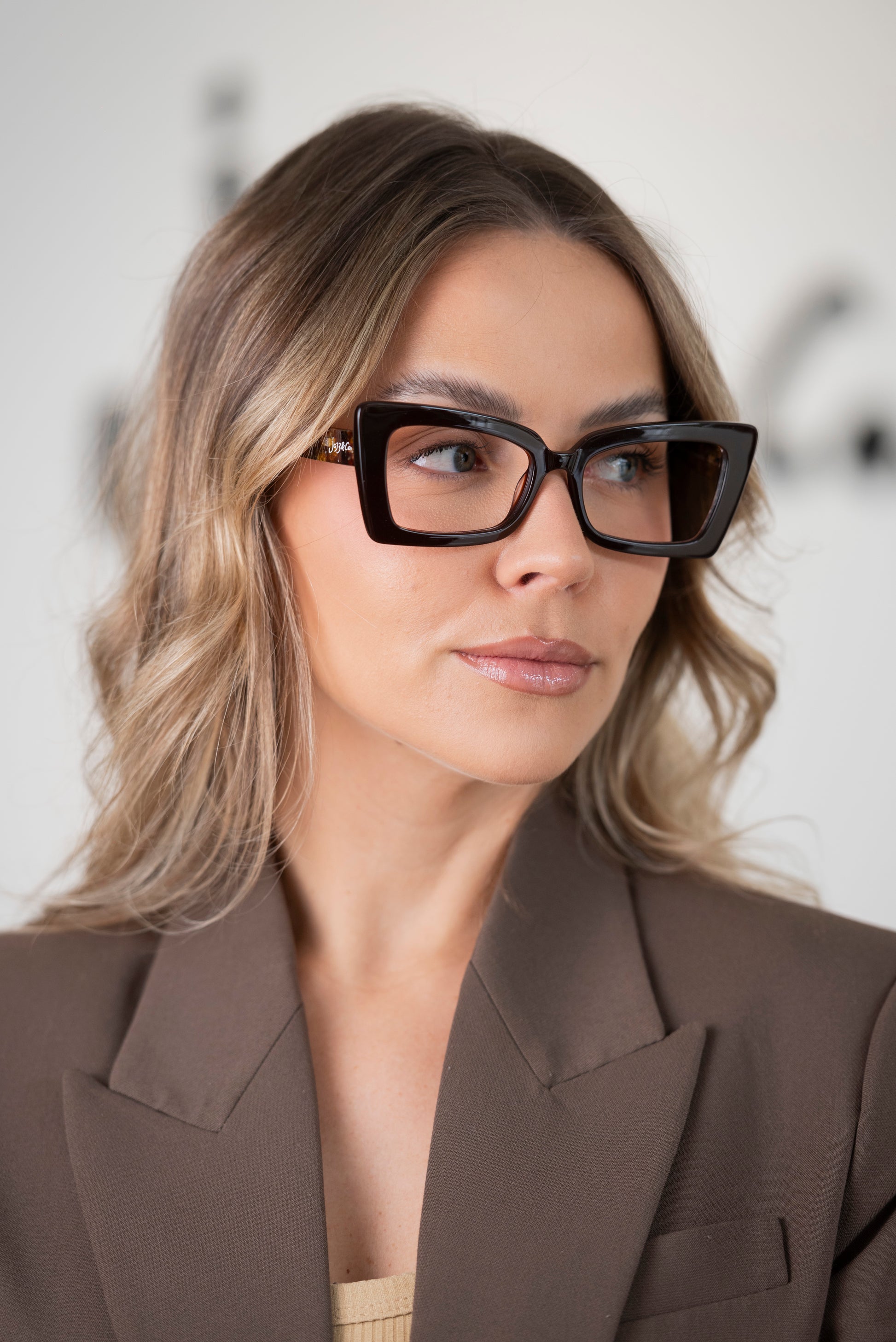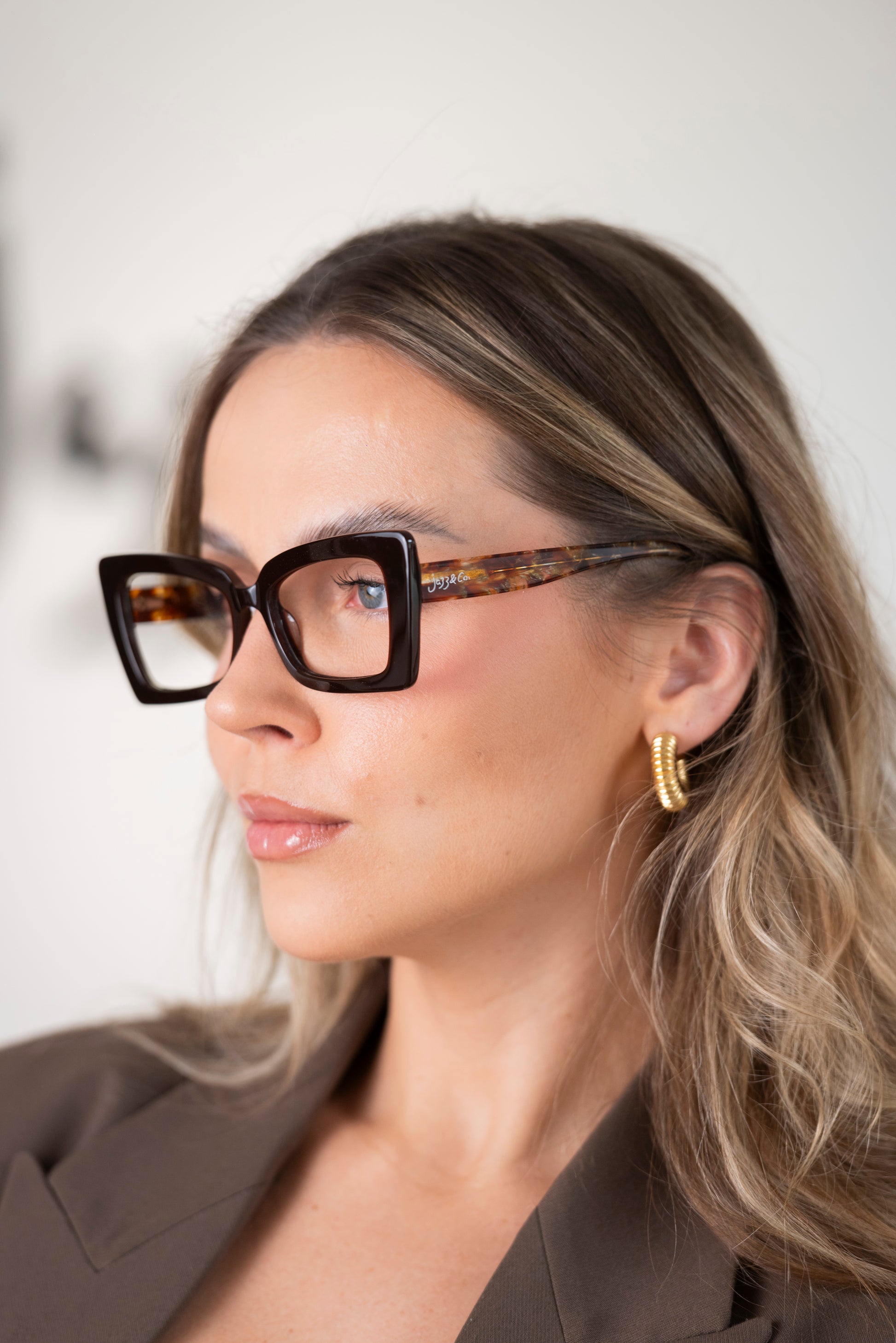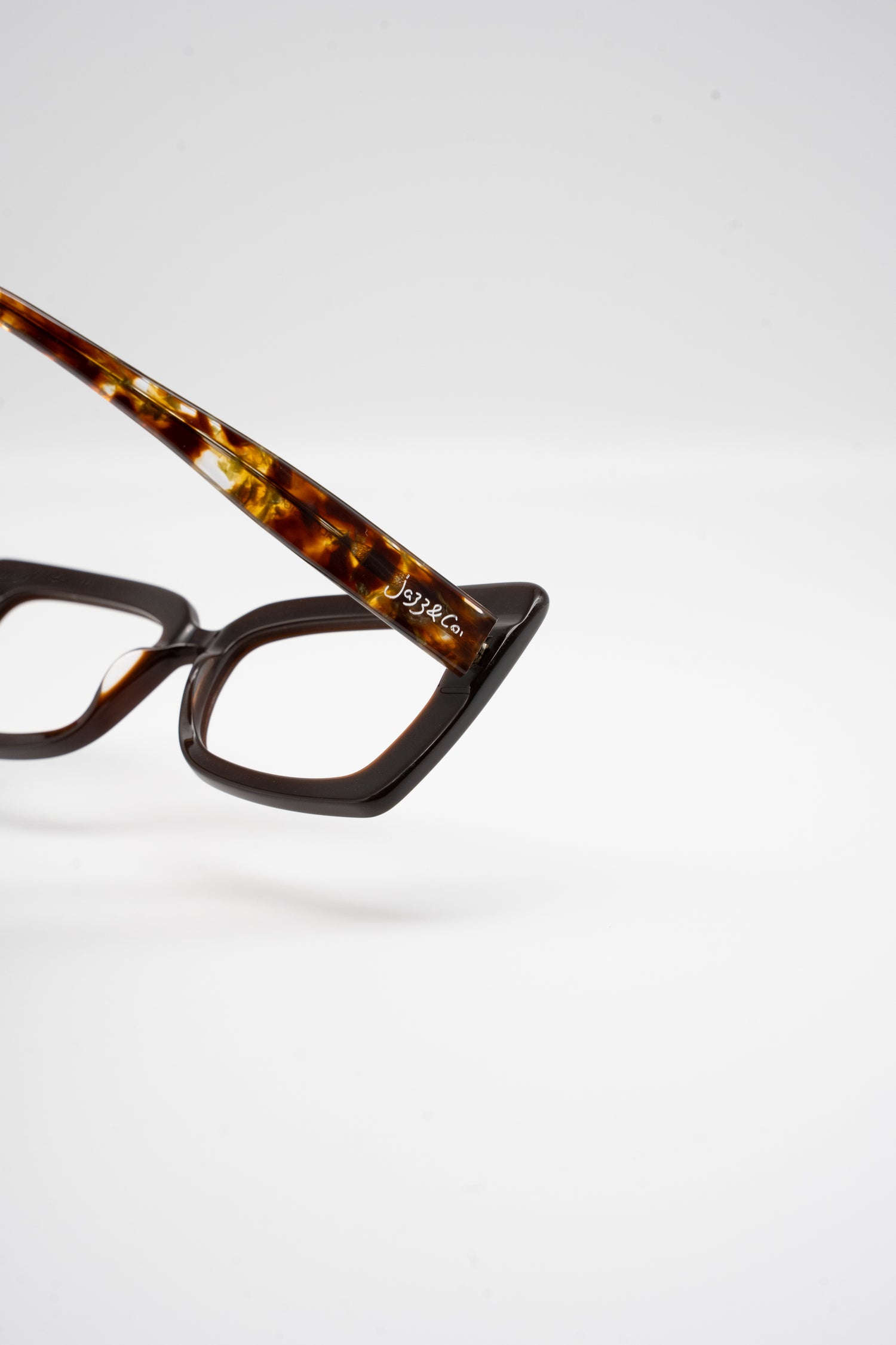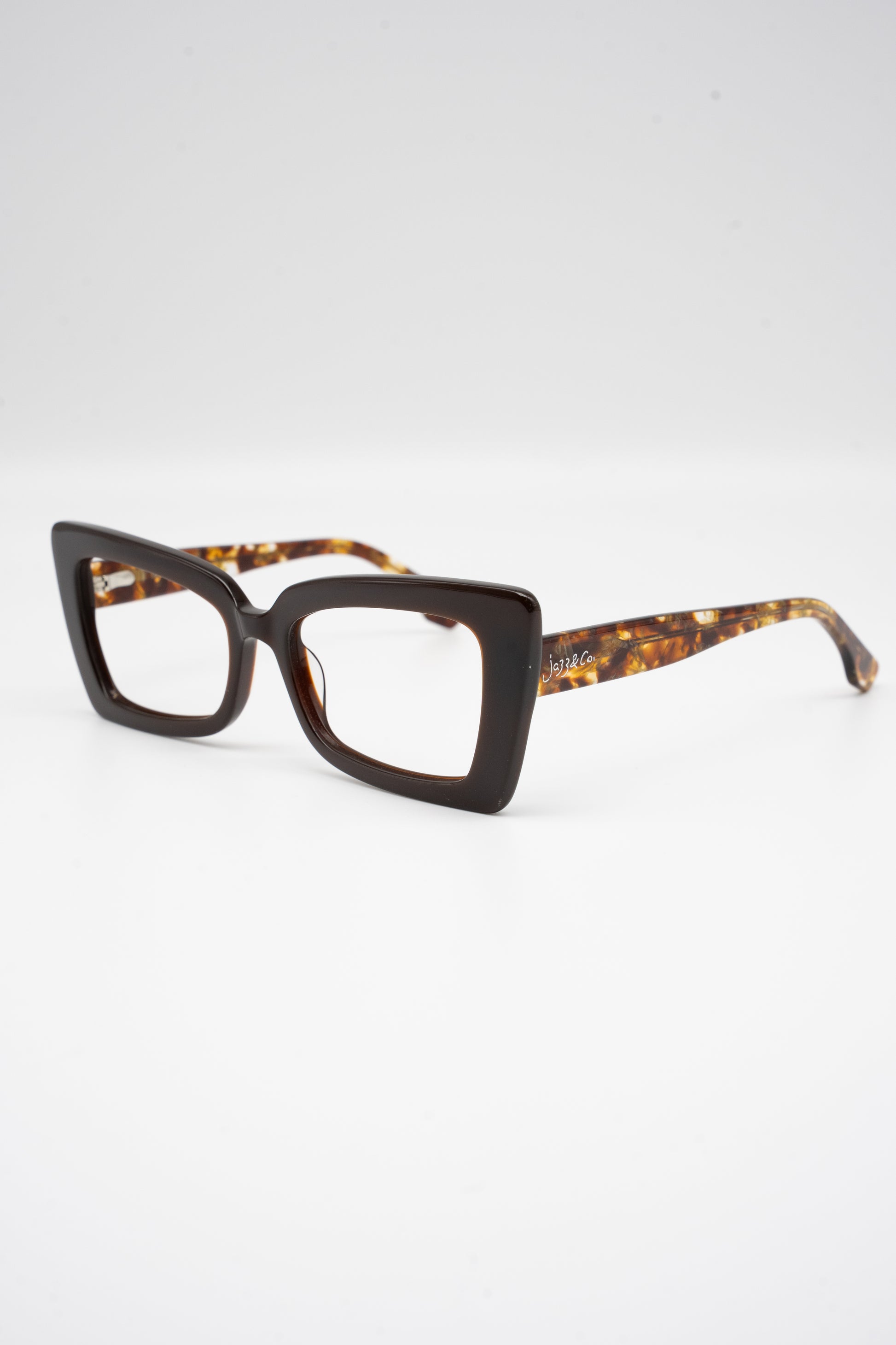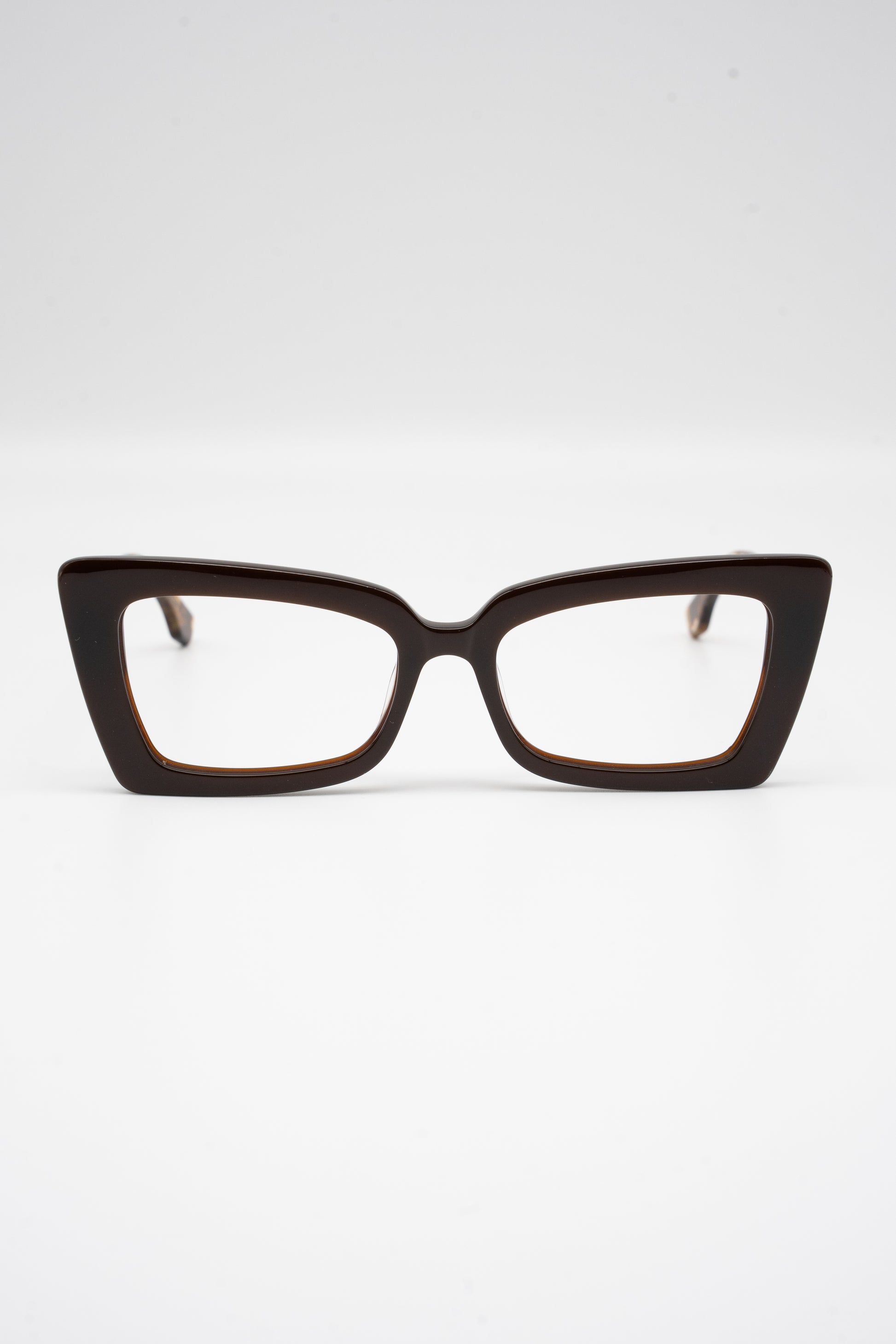 O Florença é uma armação retangular em acetato marrom, com laterais alargadas e hastes em padrão demi que reforçam sua estrutura imponente e elegante. O design de linhas retas oferece encaixe firme e confortável, ideal para rostos médios a largos.
