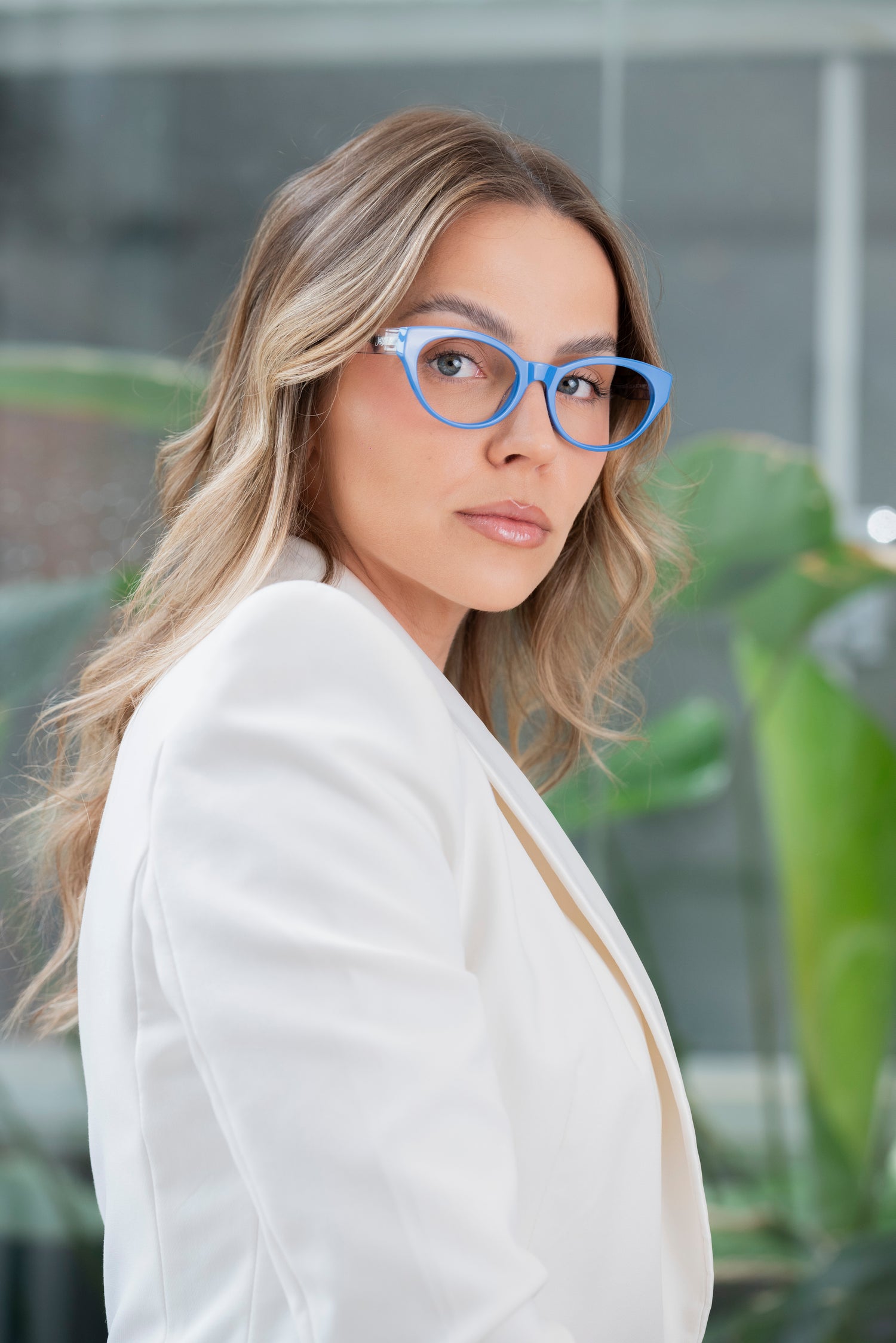 O Jasmine Blue combina frente em acetato azul-claro com hastes transparentes detalhadas por pinceladas em azul artístico, criando um contraste leve e equilibrado. Seu formato retangular suave oferece encaixe confortável para rostos médios