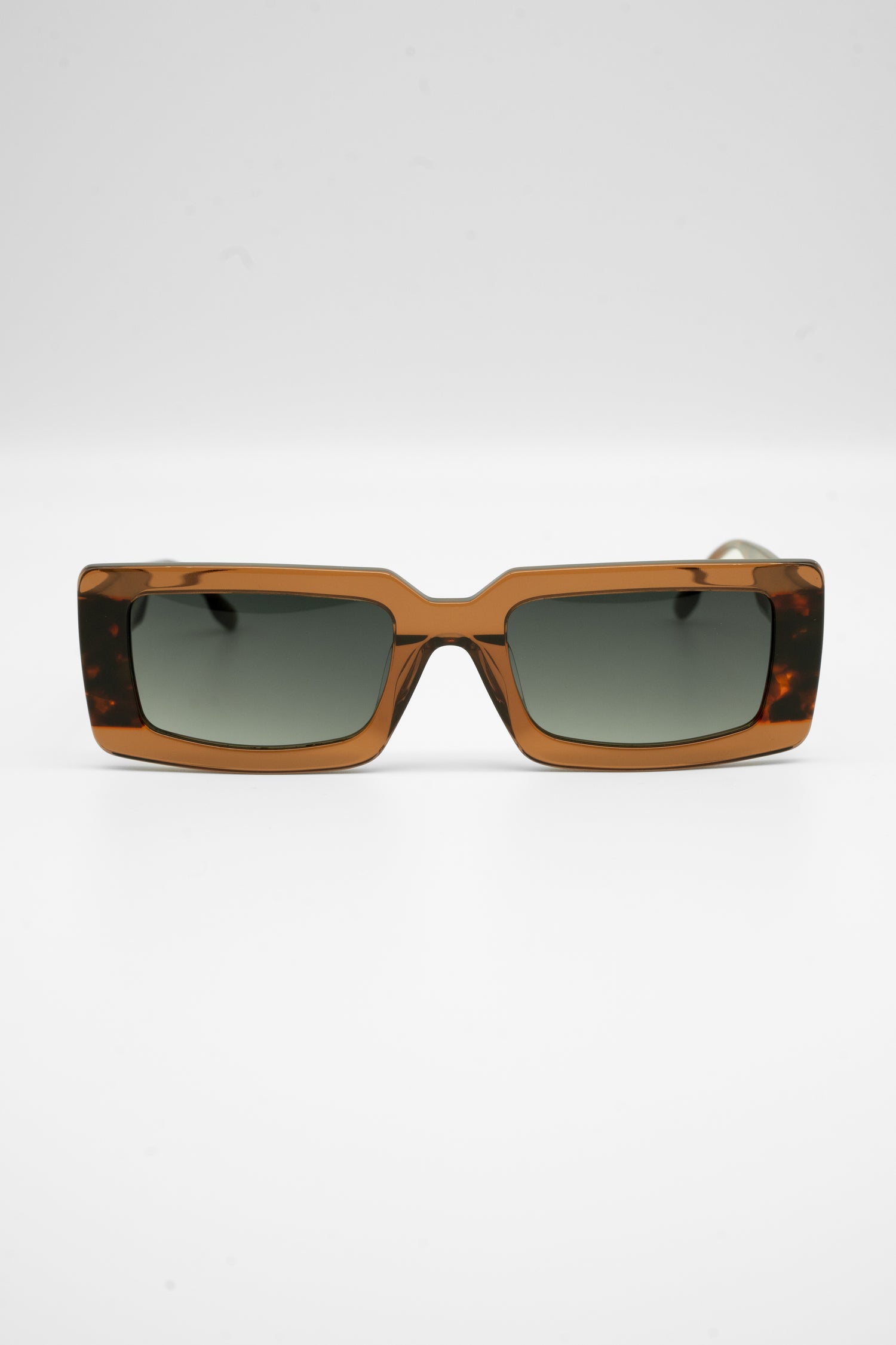Uma armação retangular alongada em acetato marrom-escuro, com acabamento polido e estrutura leve que combina minimalismo e precisão. Seu formato horizontal cria proporção equilibrada e encaixe confortável, ideal para rostos médios.