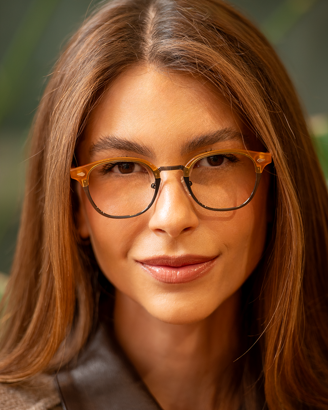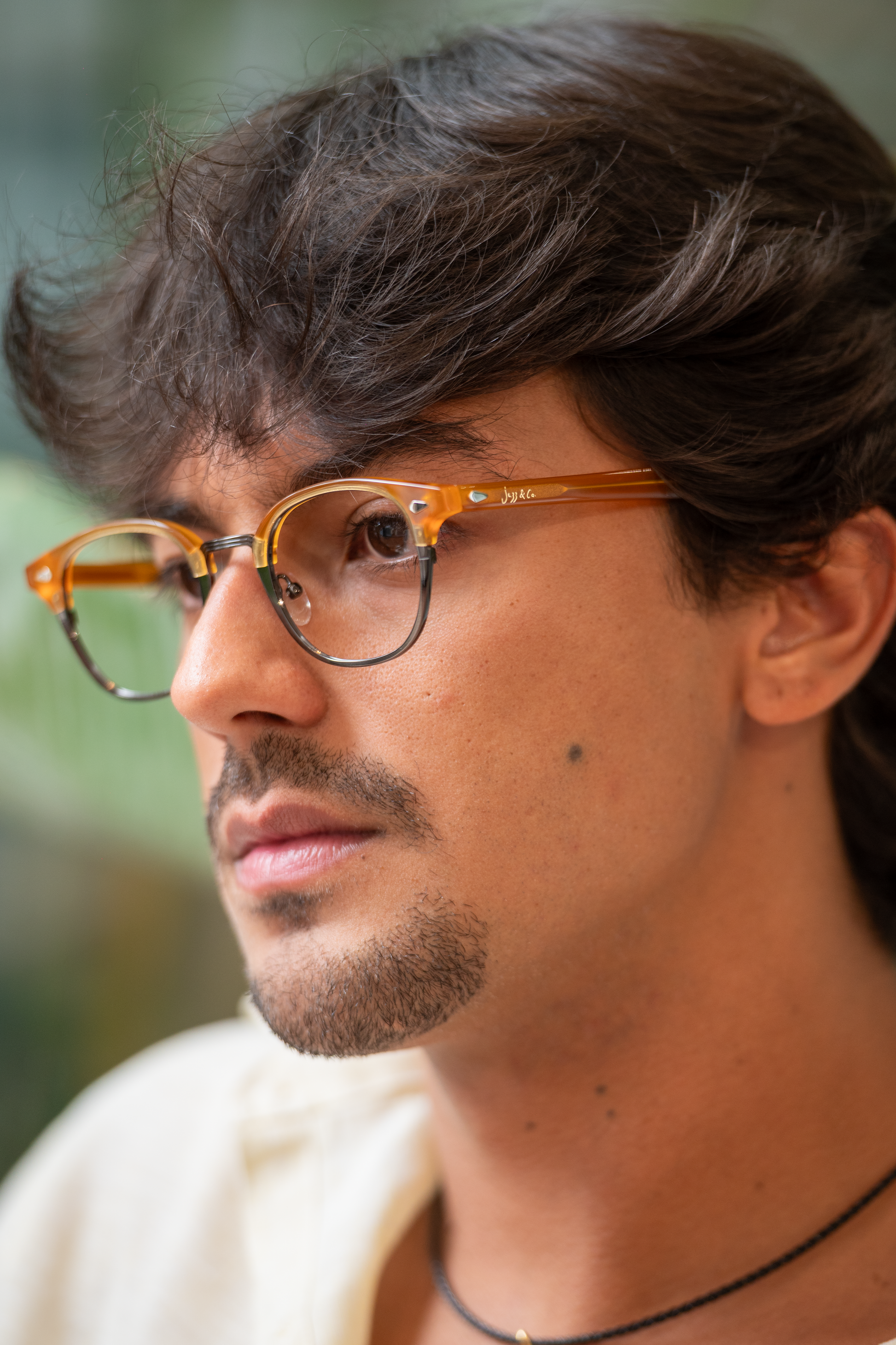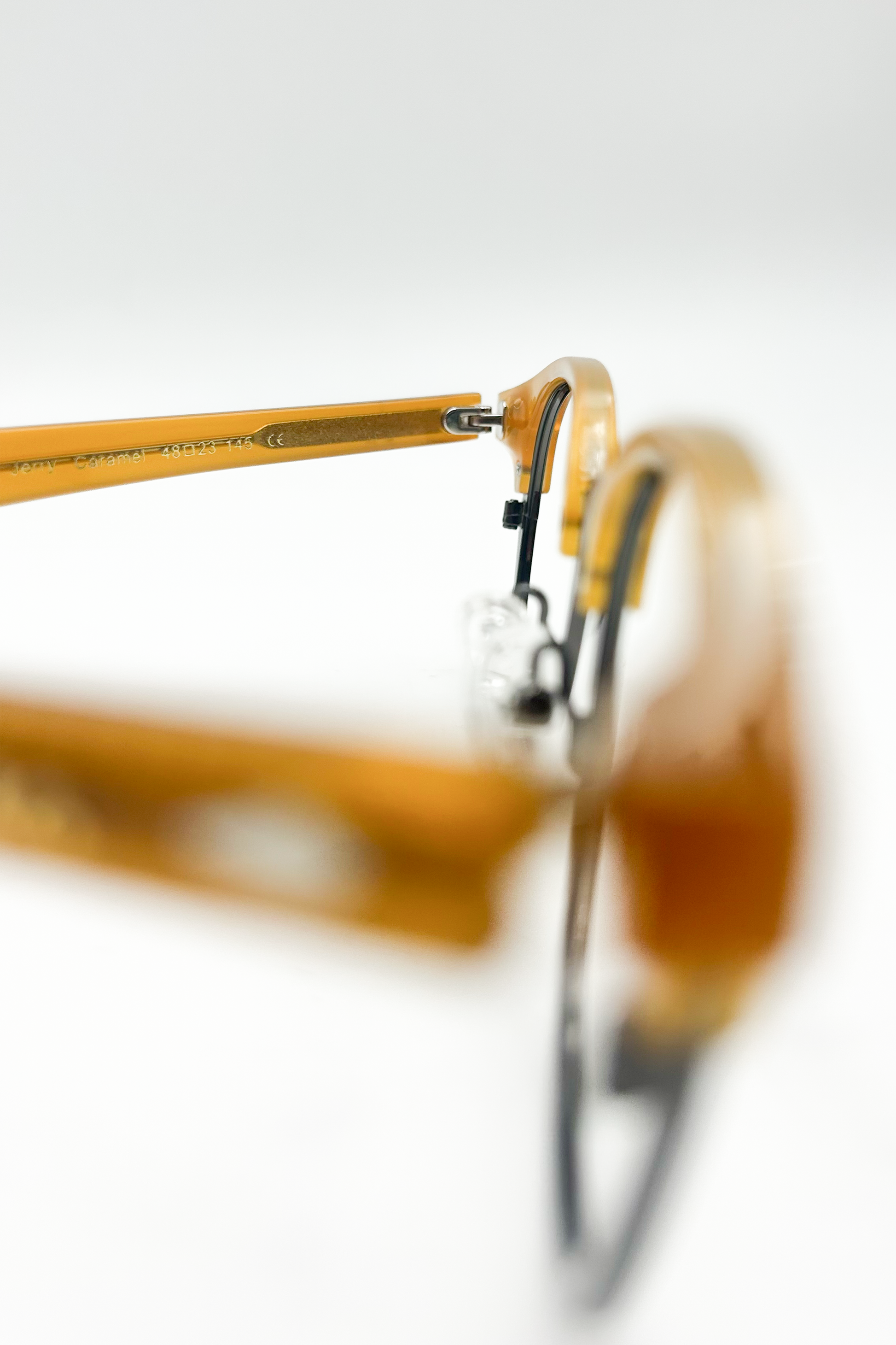 Jerry Caramel é um óculos que redefine o equilíbrio entre sofisticação e personalidade. Confeccionado em acetato caramelo, sua armação combina a leveza e o calor do material com a nobreza do aço inox na frente, criando um contraste visual que transmite refinamento.