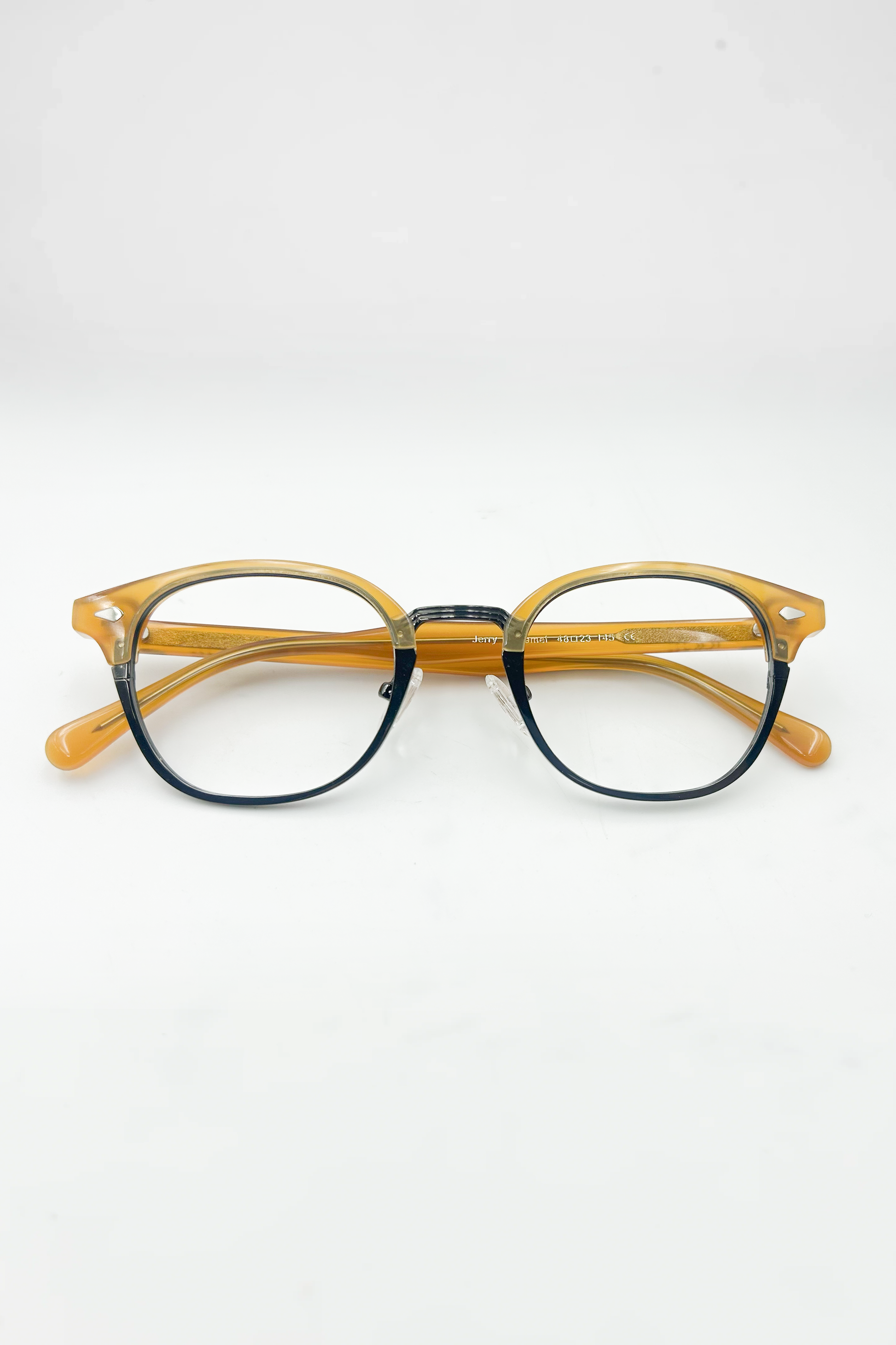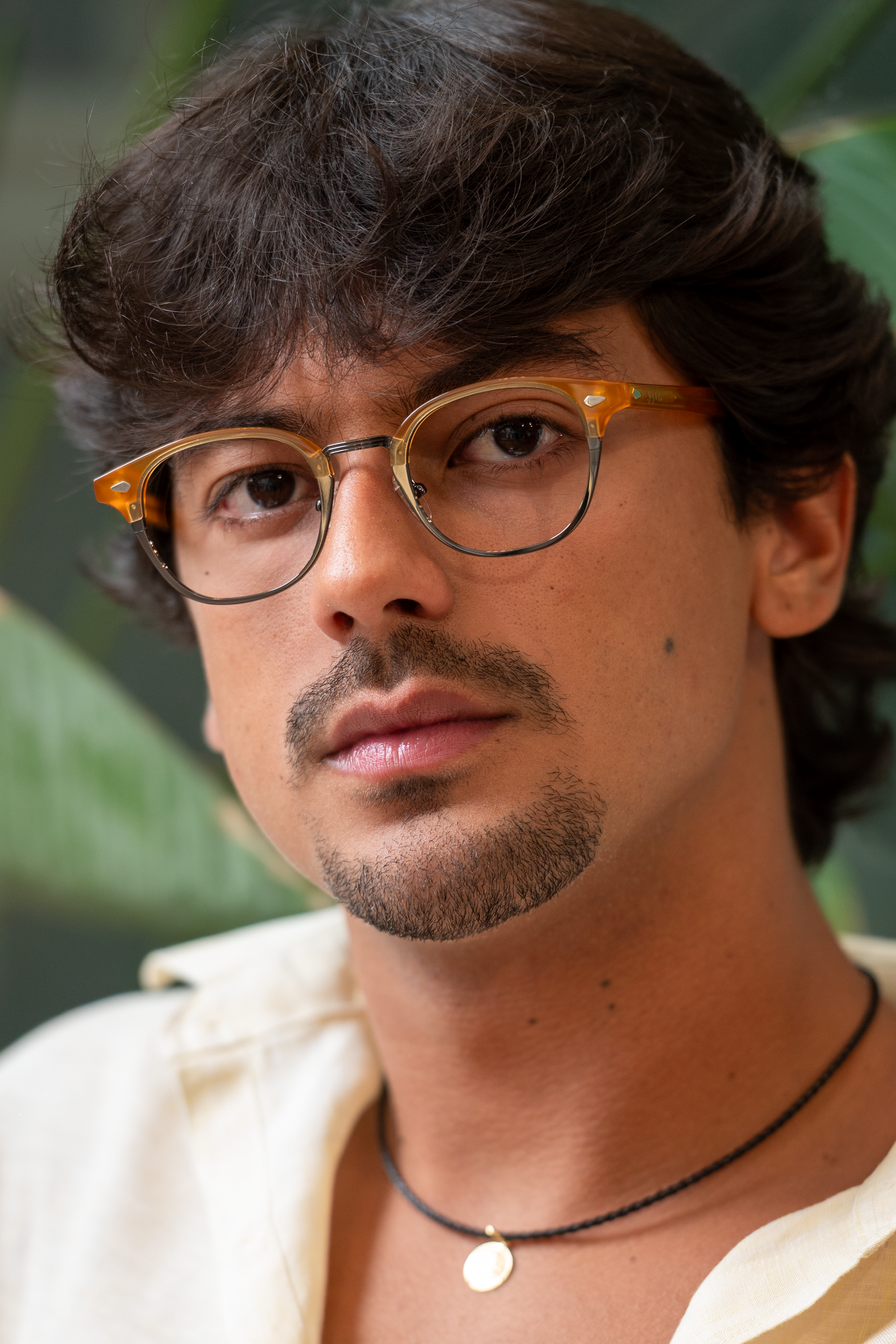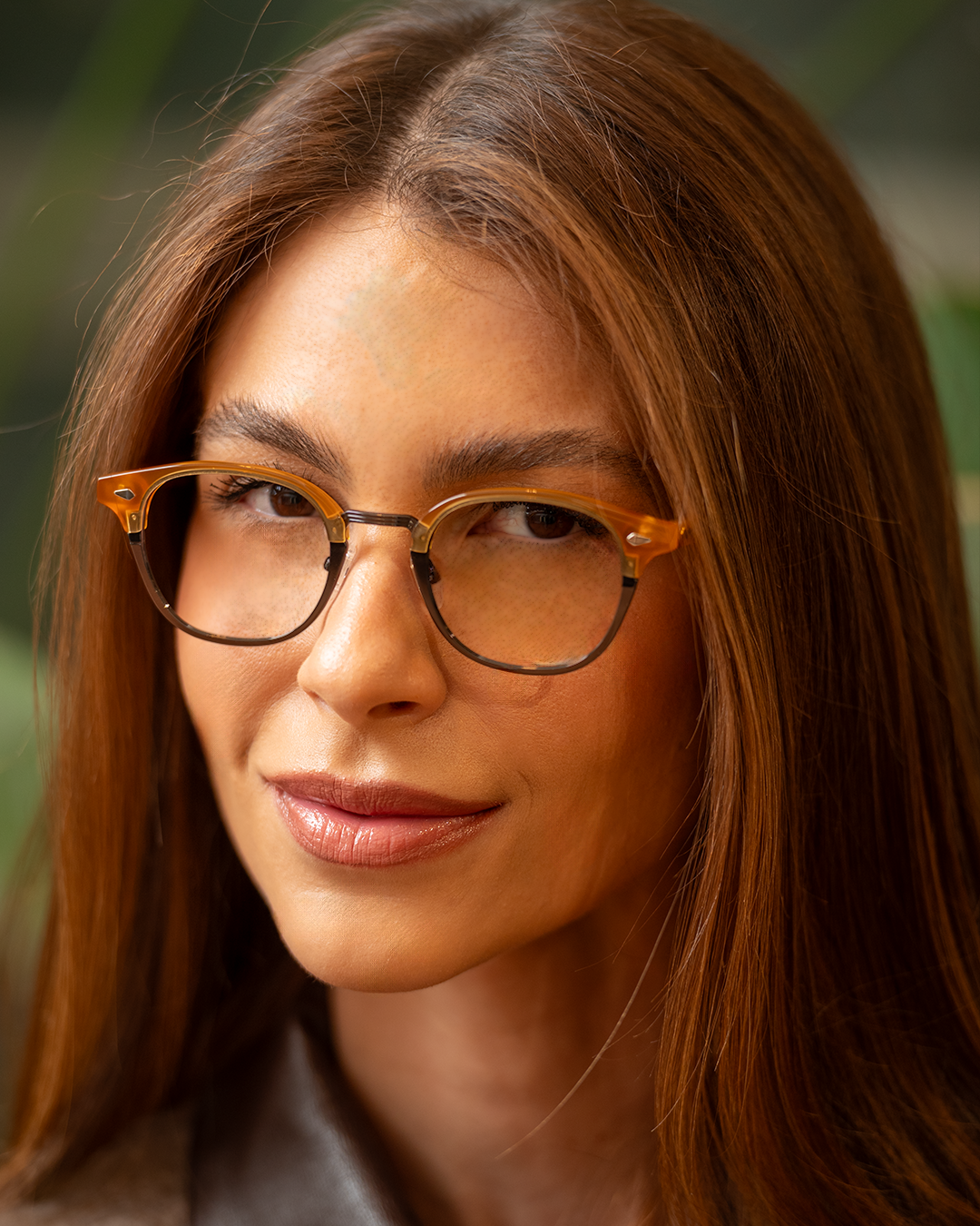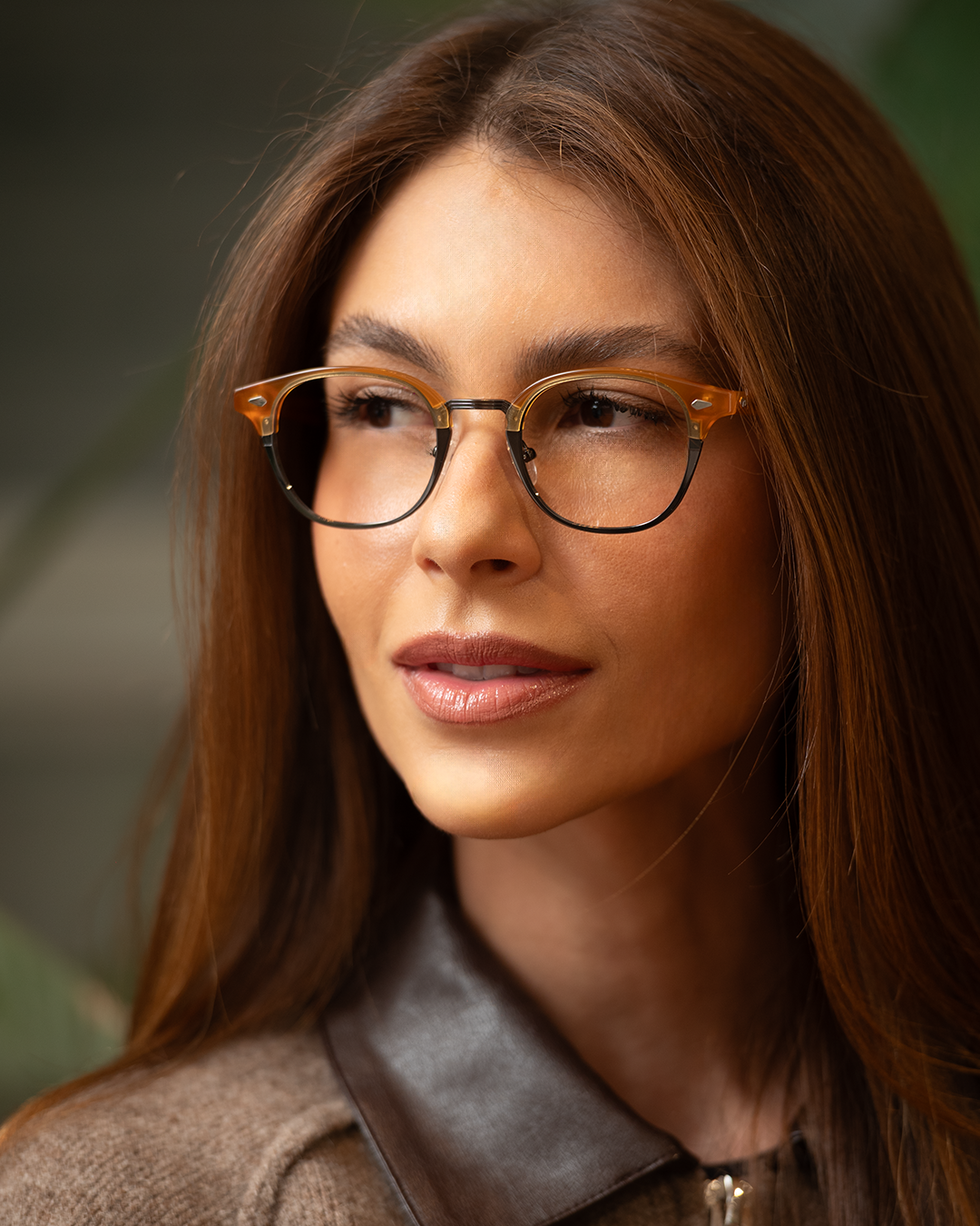 Jerry Caramel é um óculos que redefine o equilíbrio entre sofisticação e personalidade. Confeccionado em acetato caramelo, sua armação combina a leveza e o calor do material com a nobreza do aço inox na frente, criando um contraste visual que transmite refinamento.