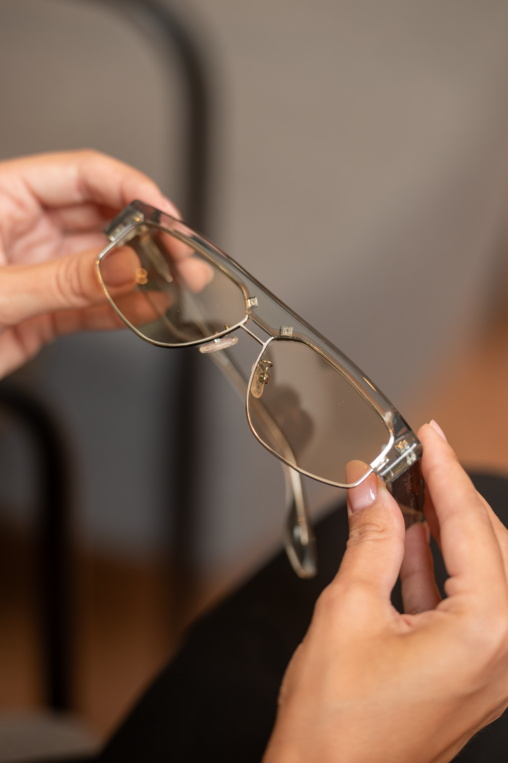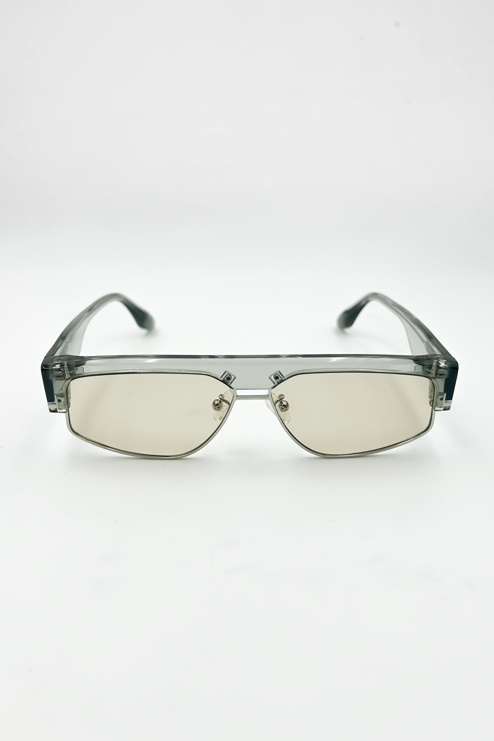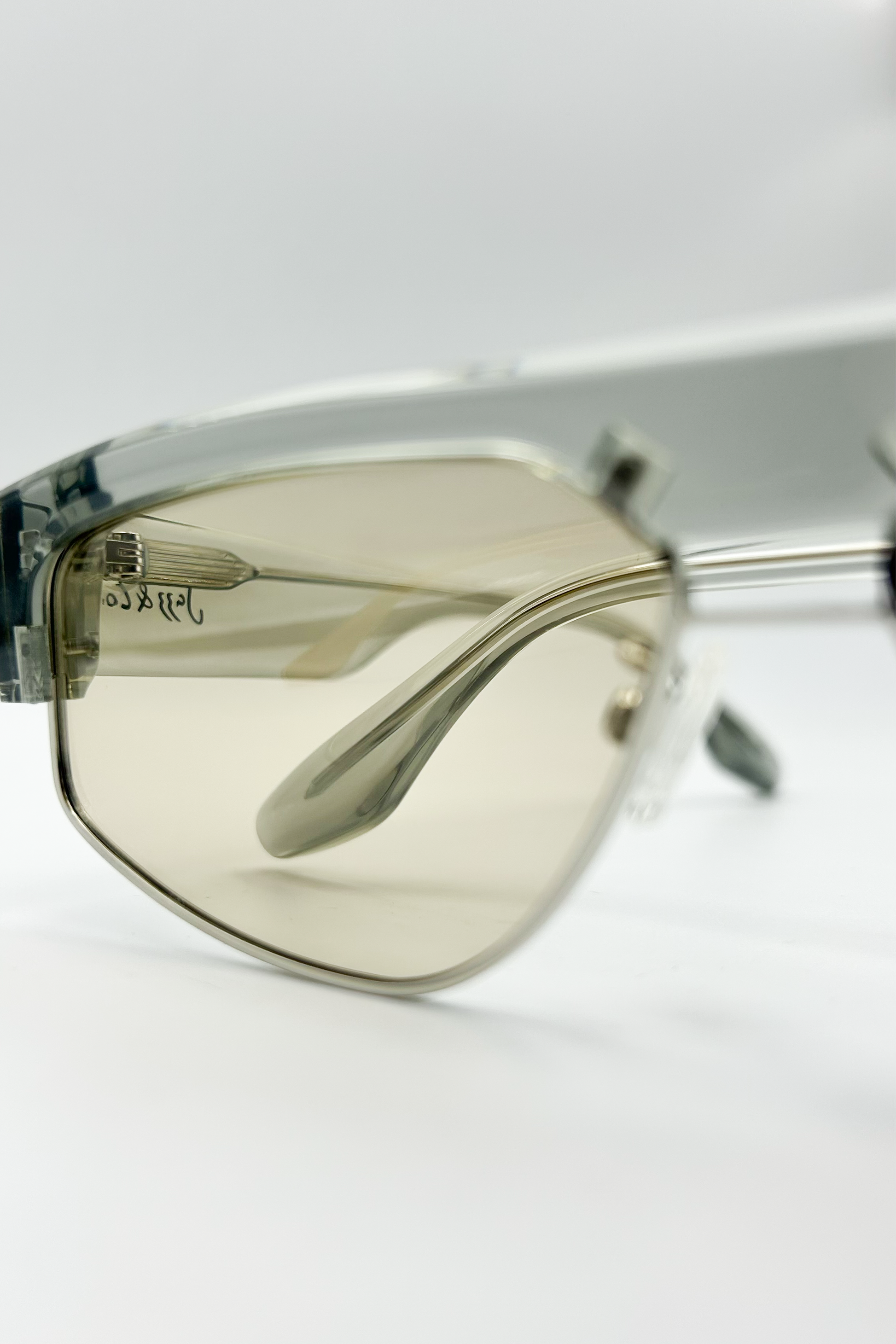 Produzido em acetato premium translúcido com estrutura interna metálica, ele oferece profundidade, brilho e um caimento impecável no rosto. As lentes em tom champagne dão um toque contemporâneo: elegantes, suaves e com leitura perfeita em ambientes internos e externos.