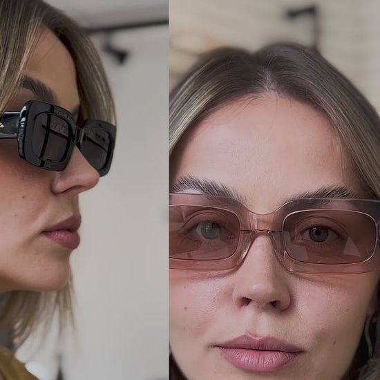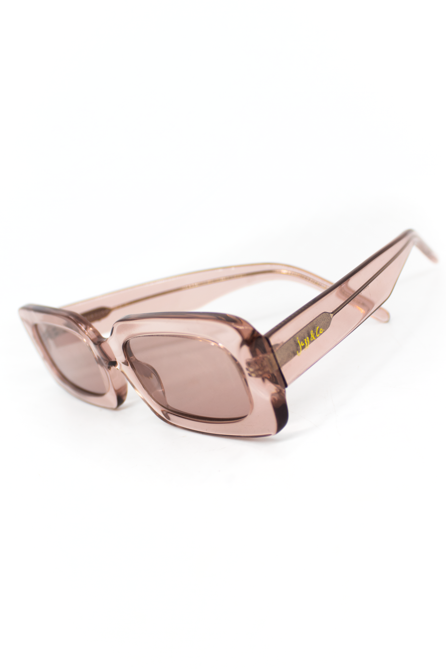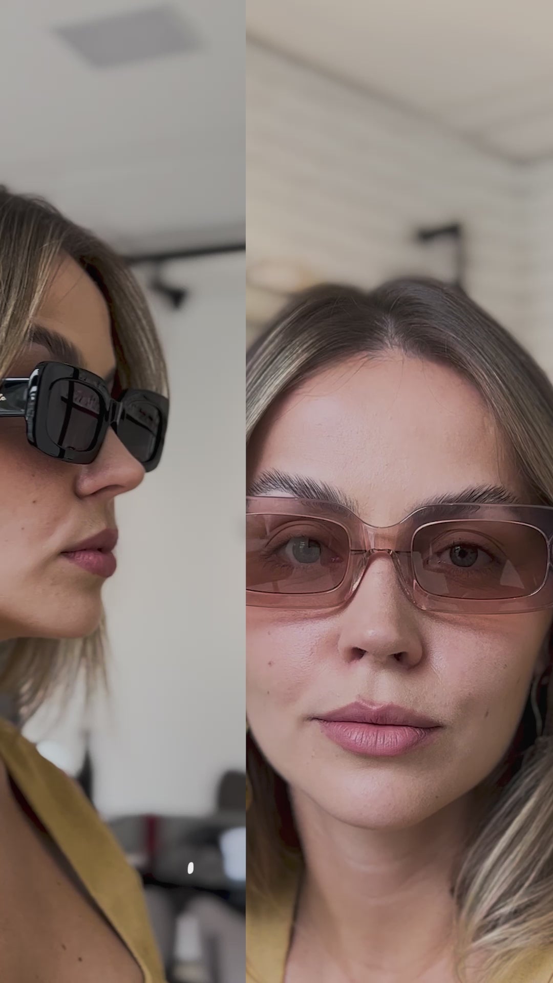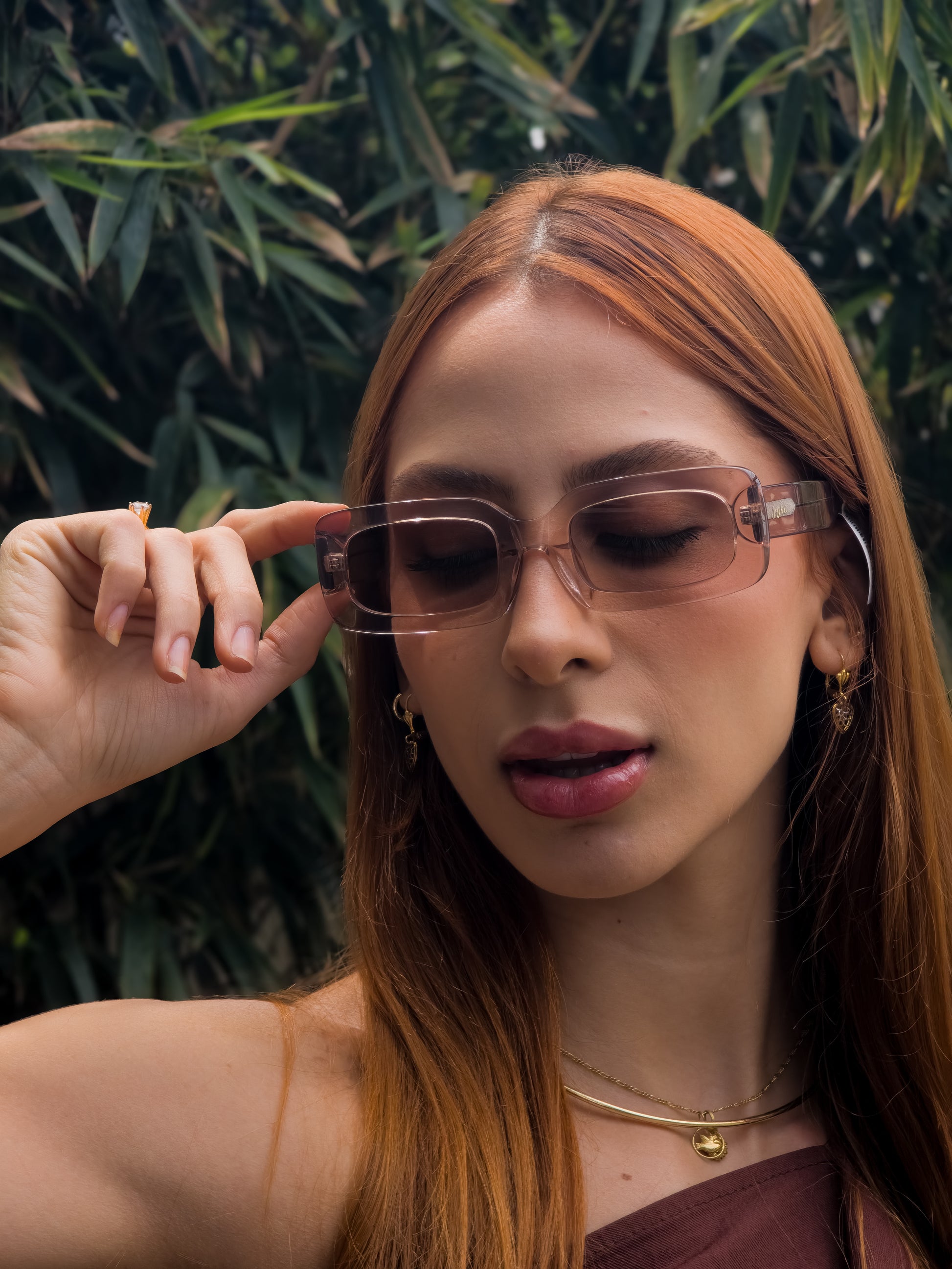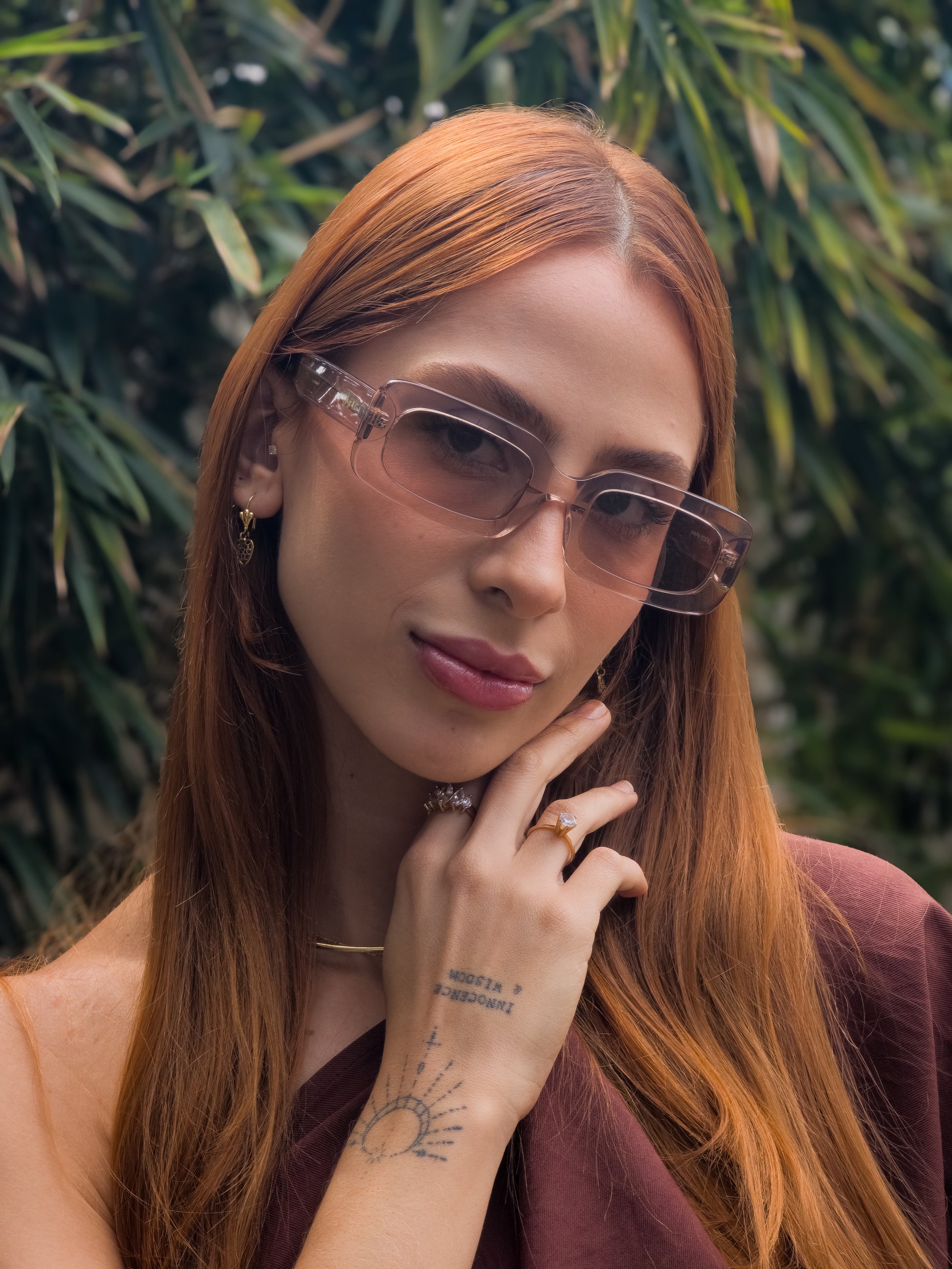 Armação retangular em acetato translúcido rosé, que combina estrutura firme, leveza e transparência sofisticada. O acabamento tonalizado das lentes cria harmonia visual, enquanto o detalhe metálico visível na haste interna reforça o caráter técnico e elegante da peça. Feita em acetato premium, oferece encaixe confortável e compatibilidade com lentes solares ou graduadas.