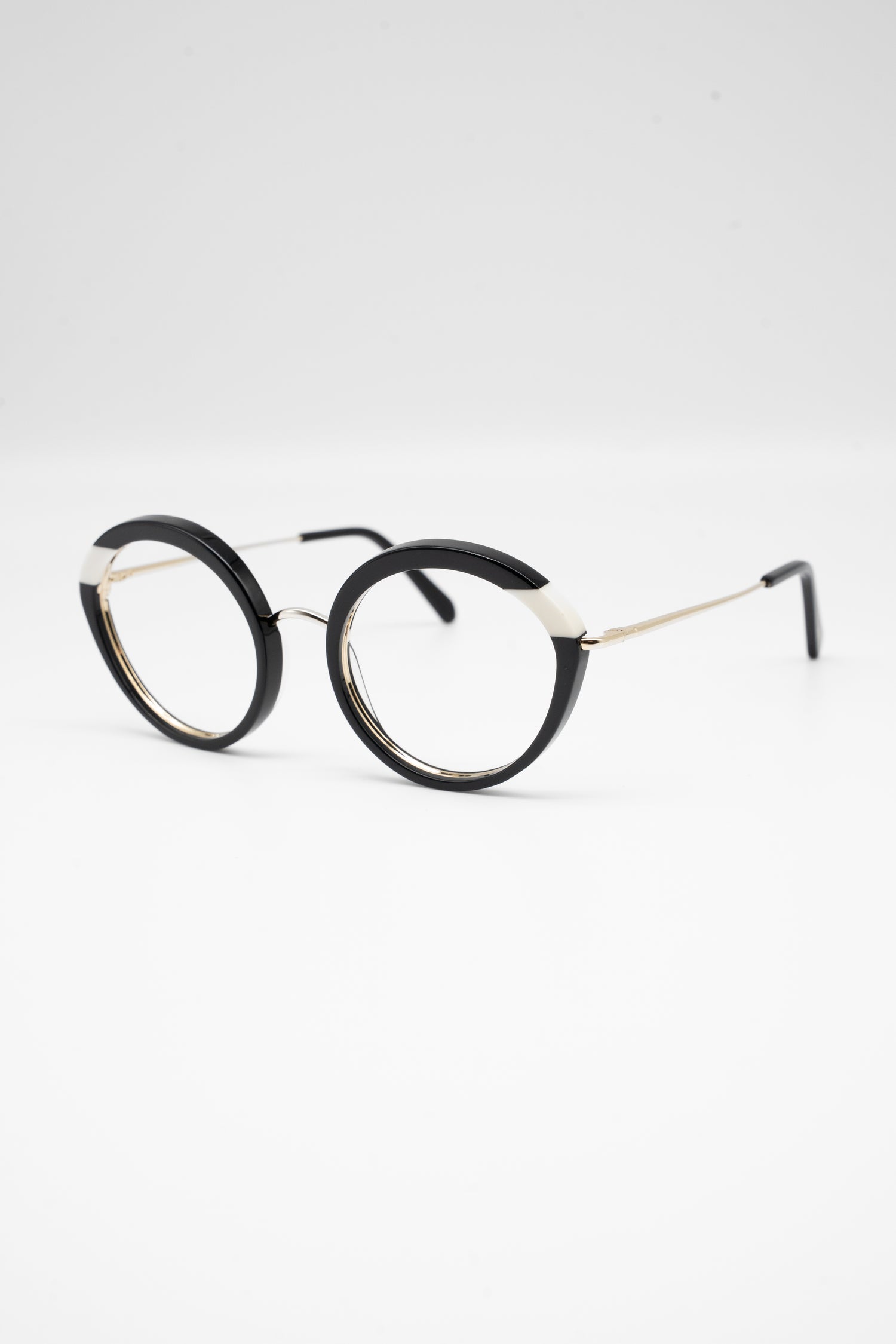O Celina é uma armação em acetato preto com linha branca diagonal, que expressa elegância através do contraste e da precisão. Sua frente robusta e hastes delicadas criam um equilíbrio harmonioso entre estrutura e leveza, garantindo encaixe confortável e proporção ideal para rostos médios.