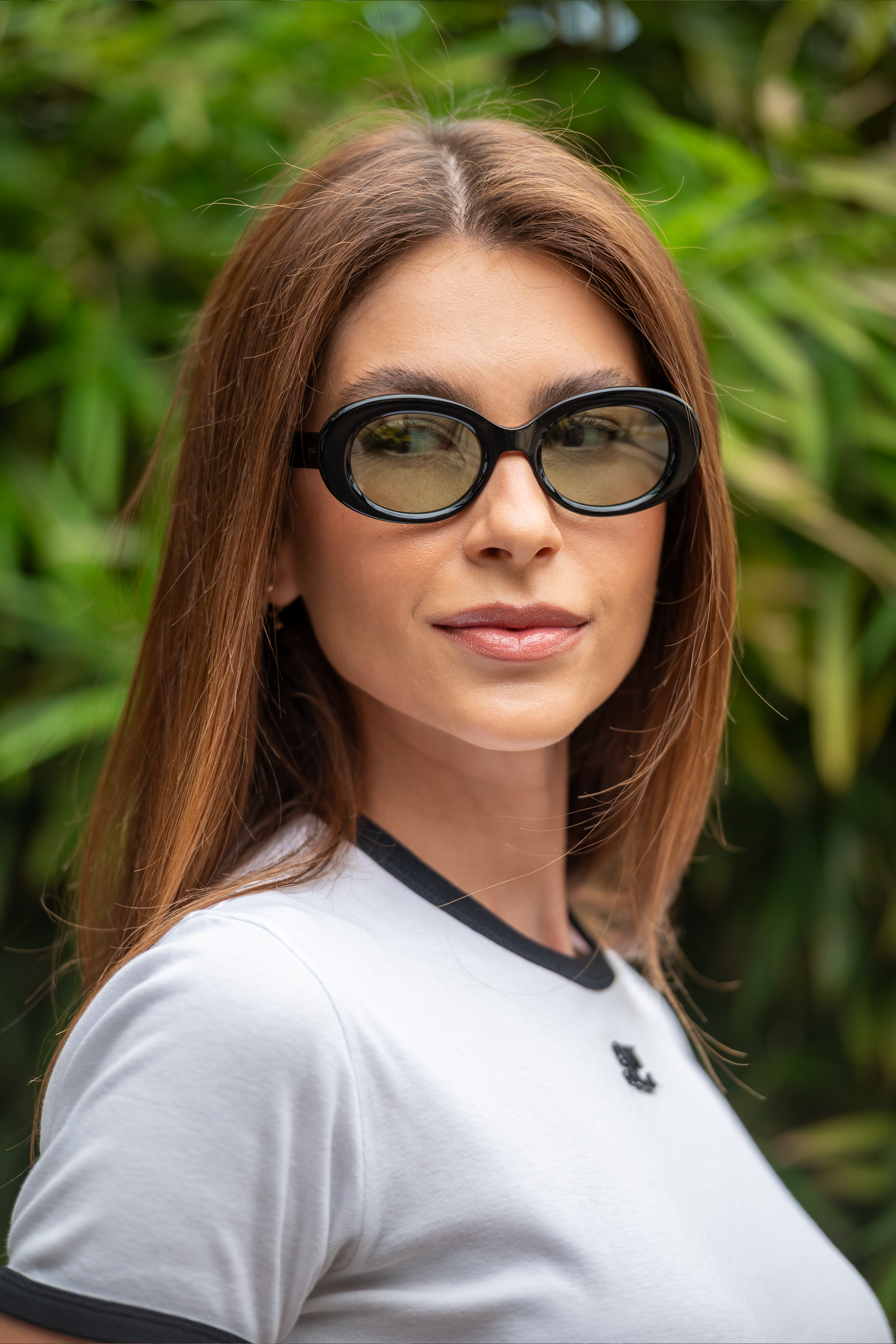 Seu shape oval traz uma aura vintage refinada, enquanto o acetato premium em Demi cria um contraste elegante com as lentes esverdeadas.