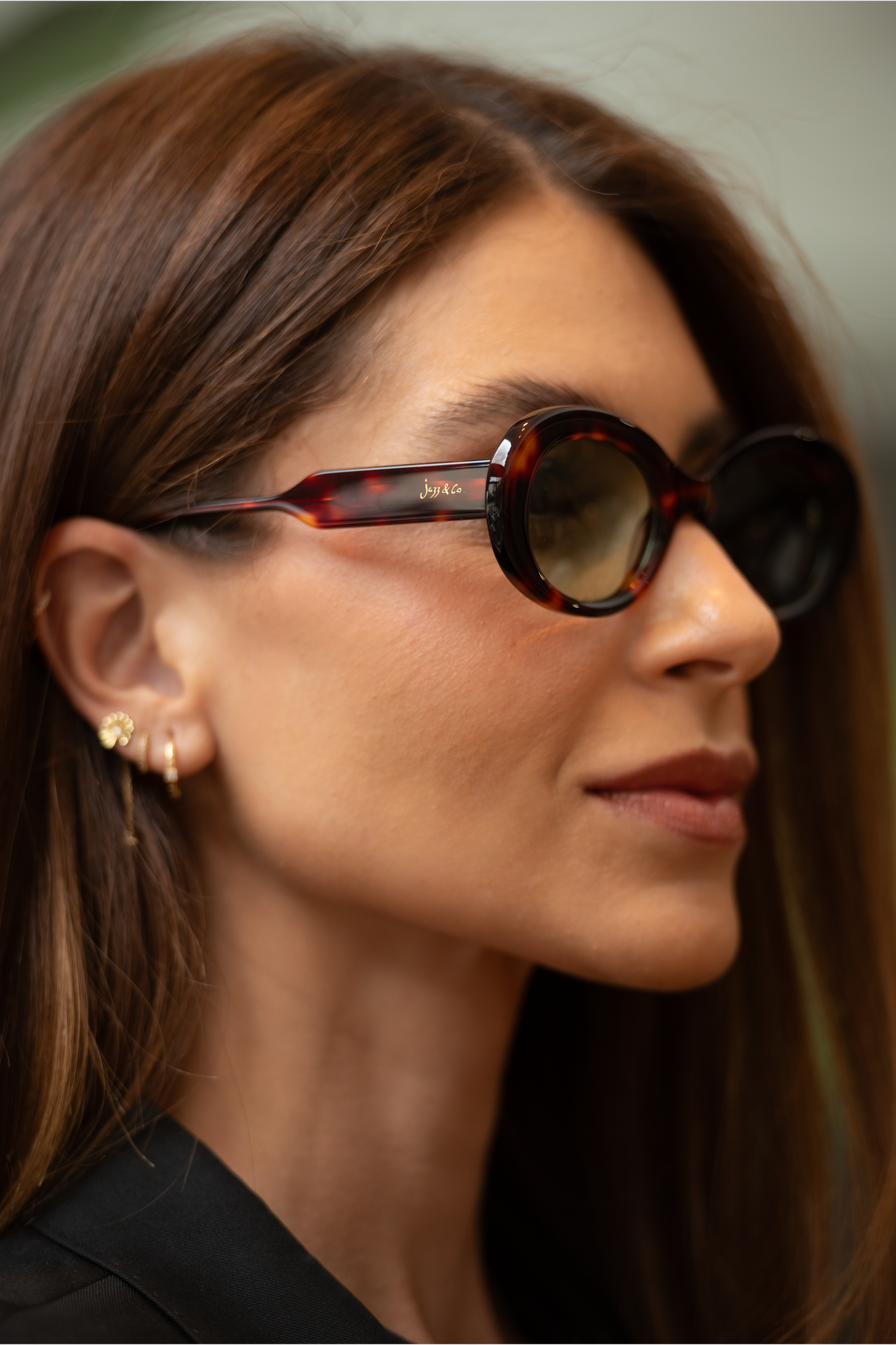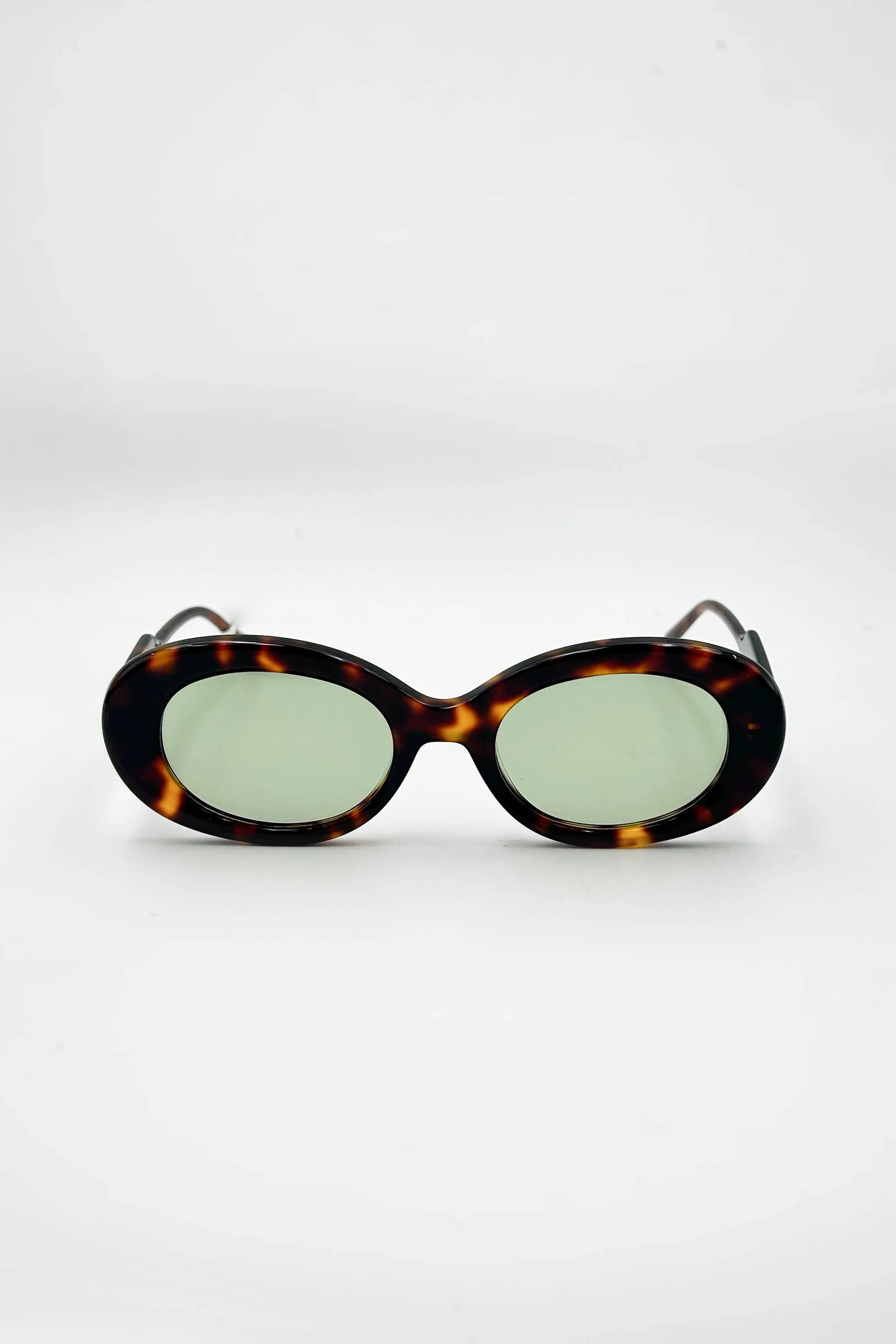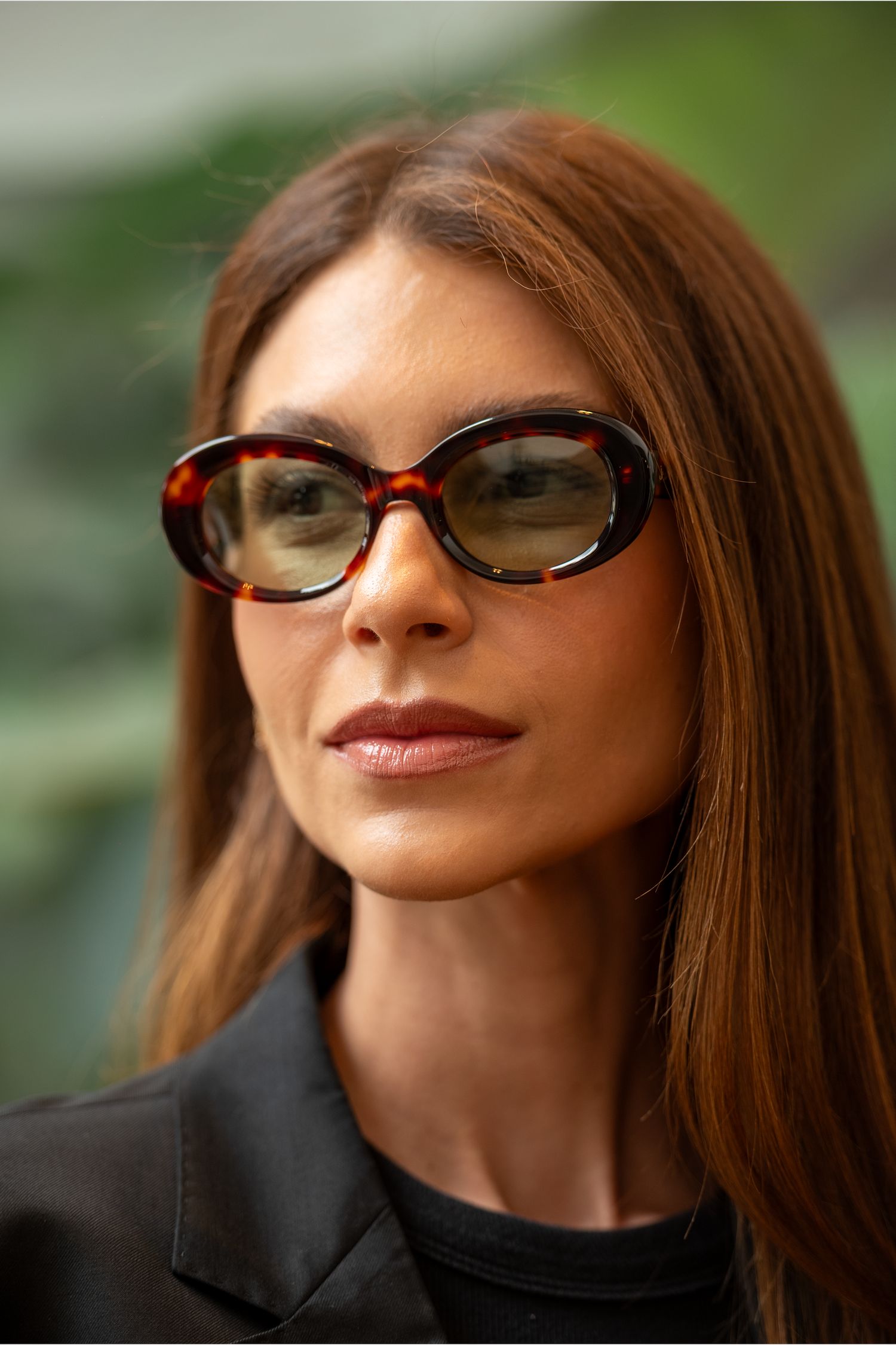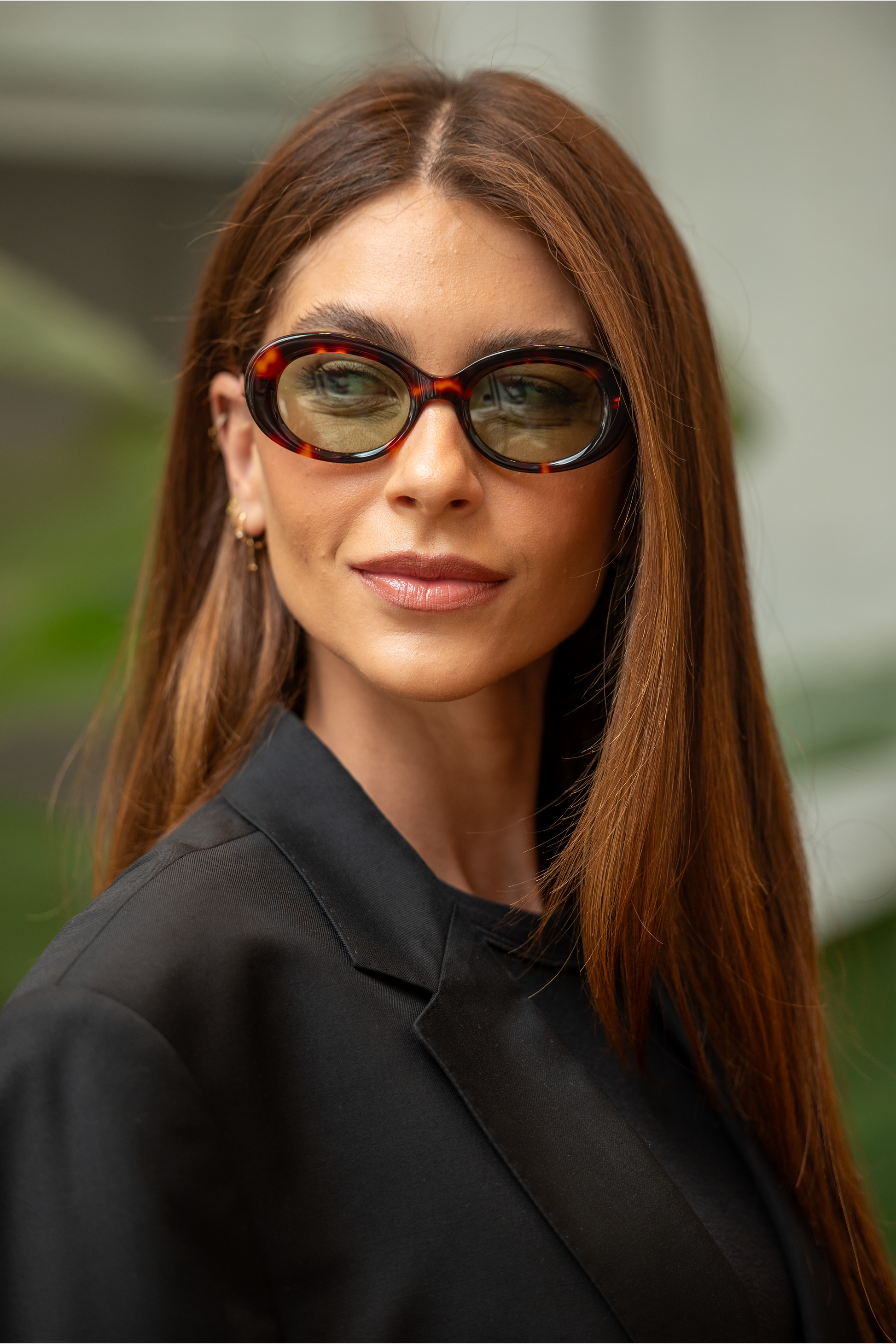 Seu shape oval traz uma aura vintage refinada, enquanto o acetato premium em Demi cria um contraste elegante com as lentes esverdeadas.