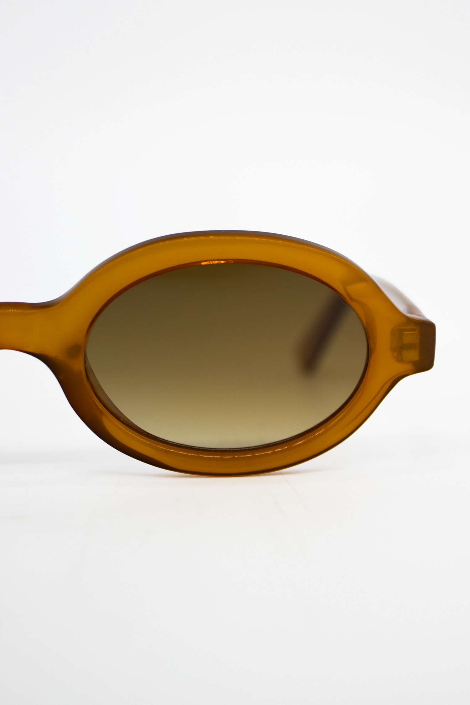 Armação helíptica em acetato premium nacional, feita à mão no Brasil com acabamento polido e brilho translúcido inspirado nos tons quentes do entardecer. Seu formato leve e curvilíneo oferece encaixe confortável para rostos médios, unindo durabilidade & ergonomia.