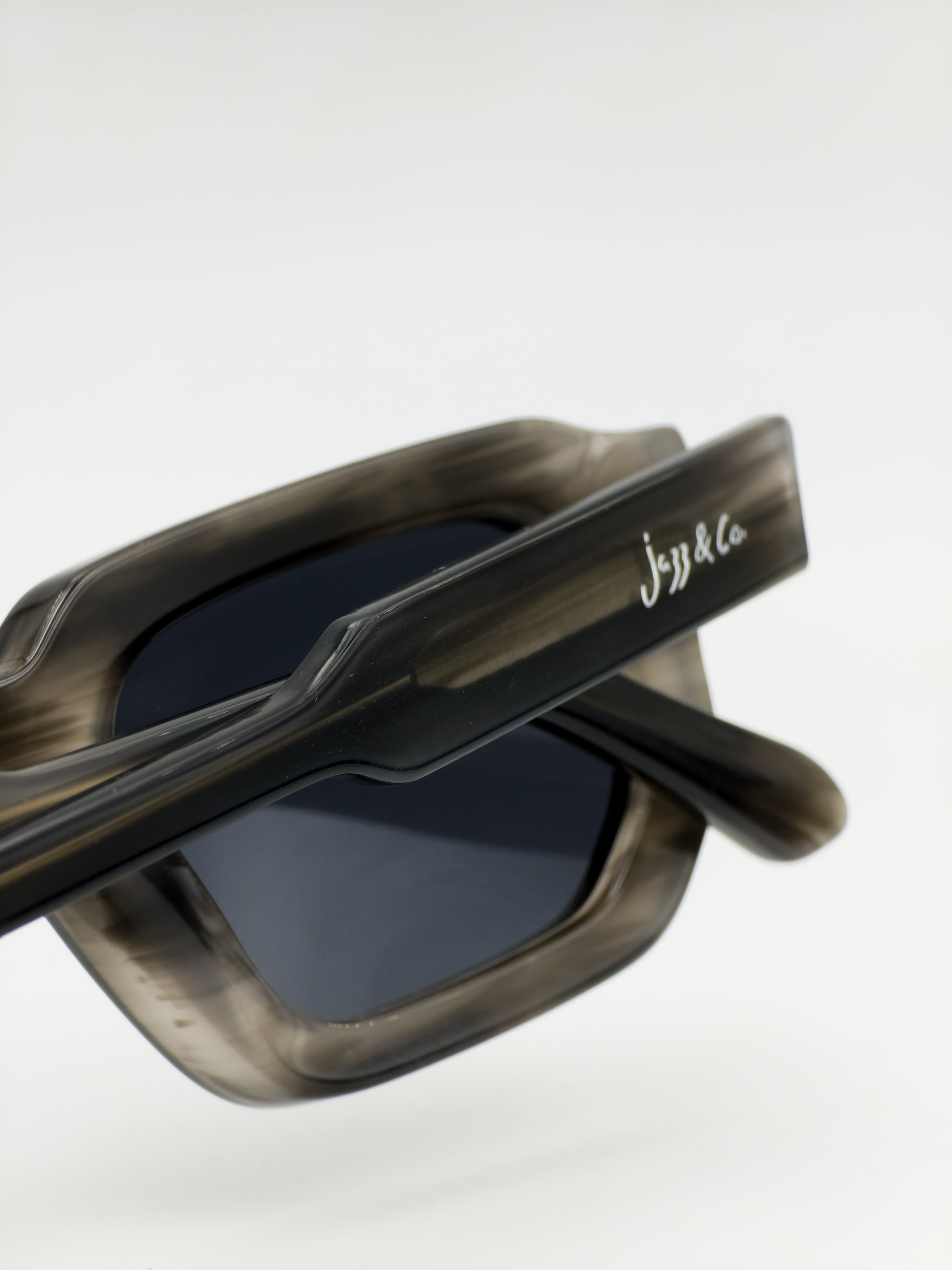 O Tribeca Gray é um solar geométrico bold em acetato premium italiano, de design brutalista e proporções precisas. Sua frente em cinza translúcido profundo e hastes espessas com leve rebaixo nas laterais criam um equilíbrio entre estrutura e conforto, ideal para rostos médios.